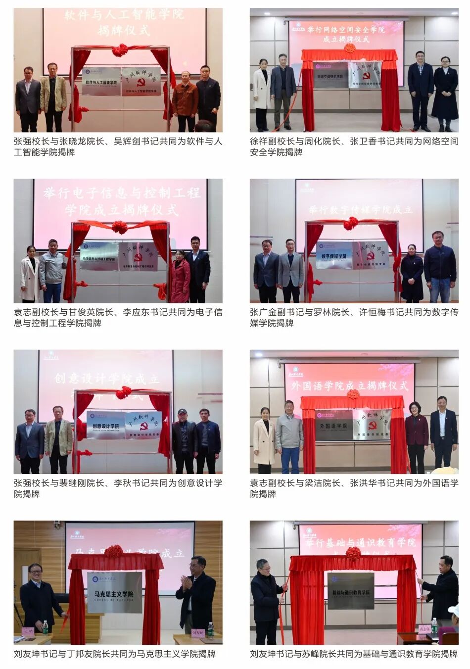 此次校内二级教学机构调整主要涉及原7个教学系和基础部、思想政治理论课教学部等共9个单位,即原软件工程系、计算机系合并成立软件与人工智能学院,原网络技术系更名成立网络空间安全学院,原电子系更名成立电子信息与控制工程学院,原游戏系更名成立数字传媒学院,原数码媒体系更名成立创意设计学院,原外语系更名成立外国语学院,原思想政治理论课教学部更名成立马克思主义学院,原基础部更名成立基础与通识教育学院。