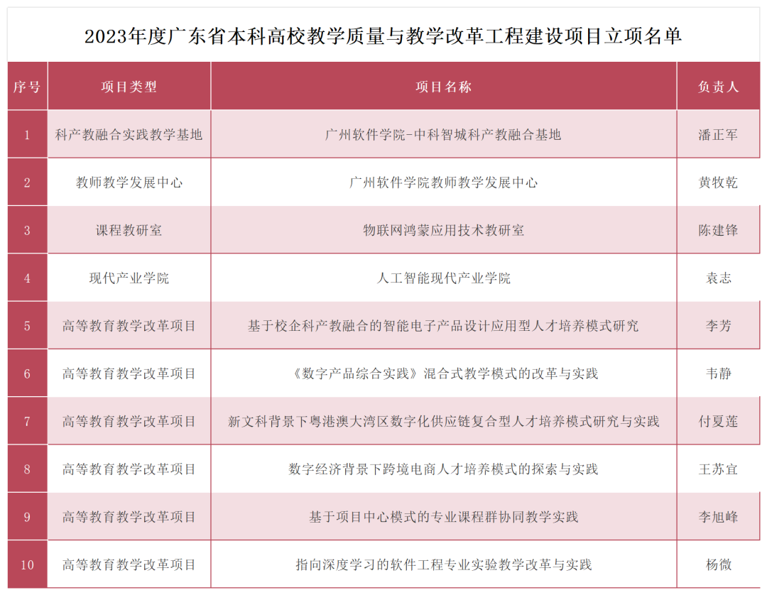 2024年1月,广东省教育厅公布《2023年度广东省本科高校教学质量与教学改革工程建设项目立项名单的通知》(粤教高函〔2024〕9号),我校10个项目获得立项,其中科产教融合实践教学基地1个,教师教学发展中心1个,课程教研室1个,现代产业学院1个,高等教育教学改革项目6个。