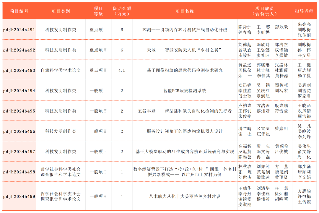 2024年,我校“攀登计划”专项资金项目得到了全校师生的积极参与,我校共9个团队项目获得专项资金资助,其中重点项目3个,一般项目6个。其中,《芯测——引领闪存芯片测试产线自动化升级》、《天域——智能安防无人机“乡村之翼”》、《基于图像指纹的恶意代码检测技术研究》获得“攀登计划”专项资金重点项目资助。