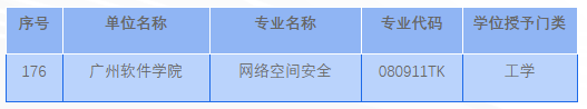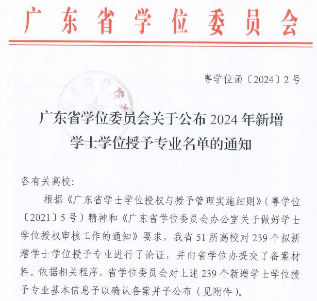 2024年6月,根据《广东省学位委员会关于公布2024年新增学士学位授予专业名单的通知》(粤学位函〔2024〕2号),我校网络空间安全新增为工学学士学位授予专业,自2024年起可授予学士学位。