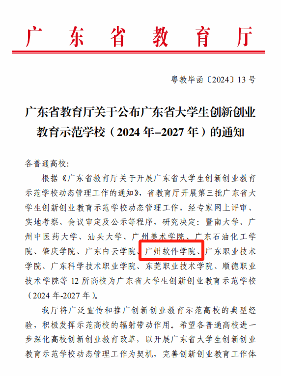 2024年12月,广东省教育厅正式公布广东省大学生创新创业教育示范学校动态管理复评结果,经专家网上评审、领导小组会议审定及公示等程序,广州软件学院等12所高校通过考核,获批入选第三批广东省大学生创新创业教育示范学校(2024年-2027年),这也是我校暨2016年首次获得该项荣誉以来,连续第三轮获此称号。