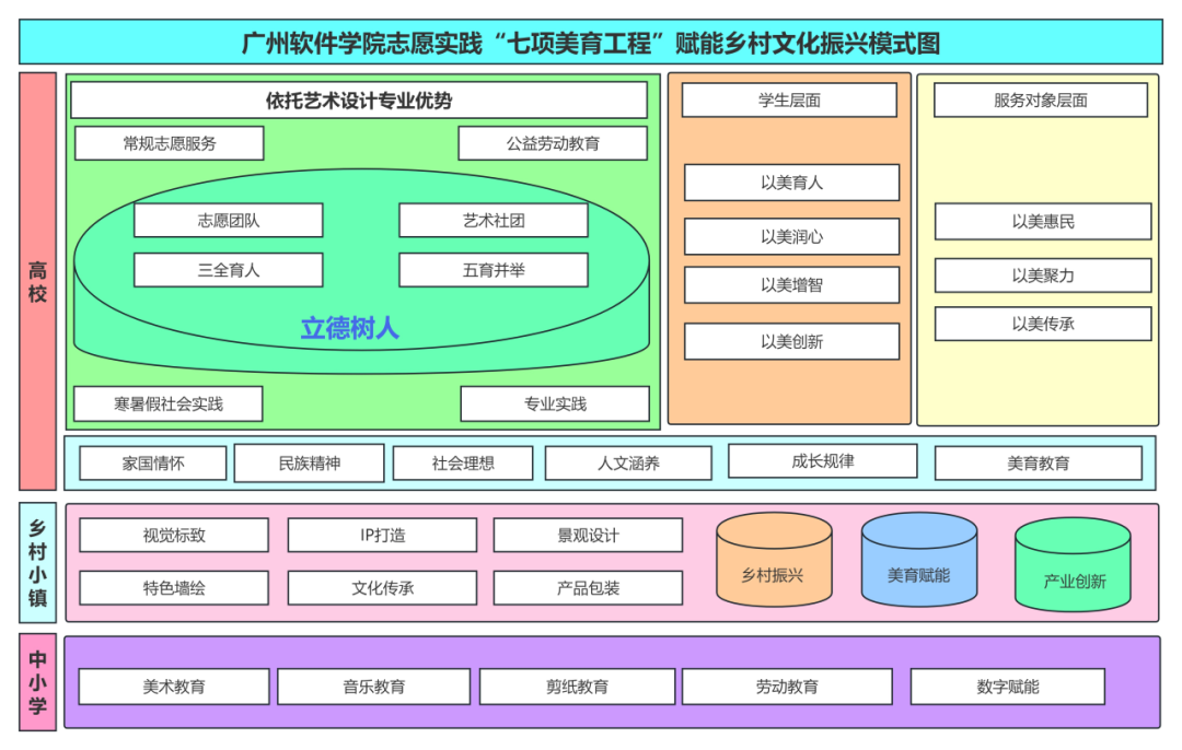 广州软件学院志愿实践“七项美育工程”赋能乡村文化振兴模式图(闫新利 制)