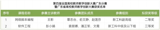 2024年5月,第四届全国高校教师教学创新大赛广东分赛决赛结果公布,我校网络技术系王影老师《网络脚本编程》课程获得副高组二等奖,软件工程系彭小娟老师《软件工程》课程获得讲师及以下组三等奖,我校荣获优秀组织奖。
