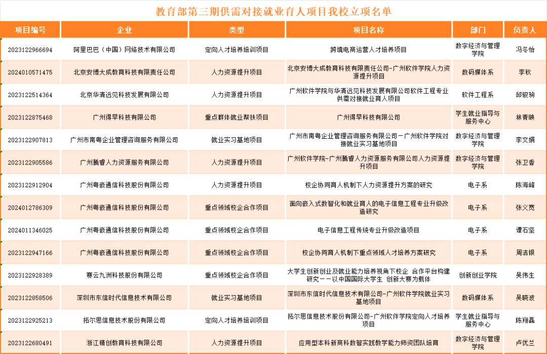 2024年6月,教育部公布了第三期供需对接就业育人项目立项名单(教就业司函〔2024〕(23)号),我校获批立项14个,项目涵盖定向人才培养培训、人力资源提升、就业实习基地、重点群体就业帮扶项目、重点领域校企合作项目五个类别。项目涉及阿里巴巴(中国)网络技术有限公司、北京安博大成教育科技有限责任公司、广州粤嵌通信科技股份有限公司、拓尔思信息技术股份有限公司等11家企业。截止日前,我校已获教育部产学合作协同育人项目、教育部供需对接就业育人项目累计103项。