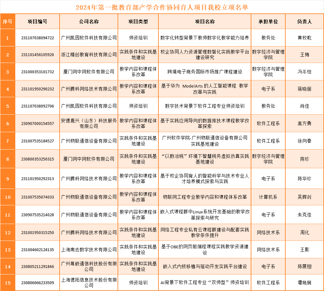 2024年5月,教育部高等教育司发布了《教育部高等教育司关于公布2024年第一批产学合作协同育人项目立项名单的通知》,我校15个项目获得立项,其中,教学内容和课程体系改革6项,师资培训3项,实践条件和实践基地建设6项。截止日前,我校已获教育部产学合作协同育人项目累计89项。
