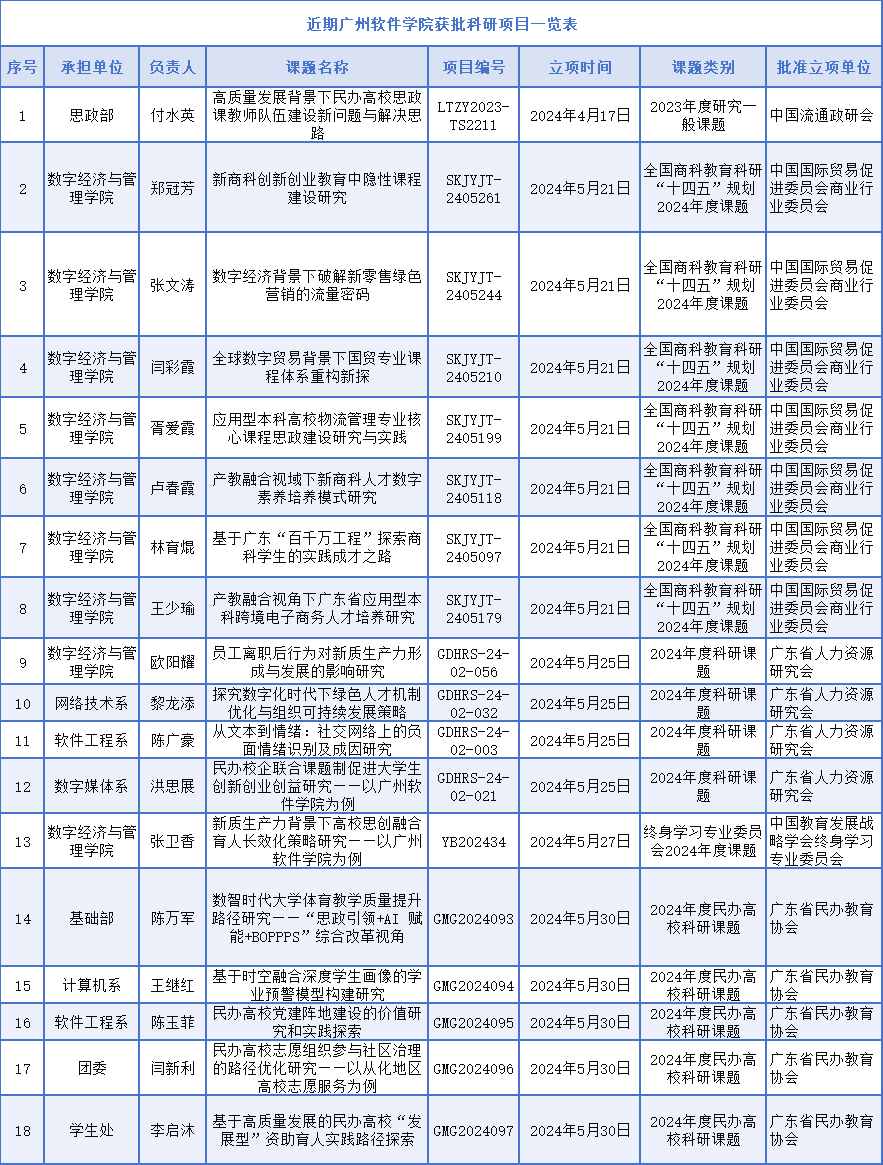 思政部付水英老师主持的《高质量发展背景下民办高校思政课教师队伍建设新问题与解决思路》获得中国流通政研会2023年度研究一般课题立项;数字经济与管理学院郑冠芳老师承担的《新商科创新创业教育中隐性课程建设研究》等7项课题获得全国商科教育科研“十四五”规划2024年度课题立项;数字经济与管理学院欧阳耀老师负责的《员工离职后行为对新质生产力形成与发展的影响研究》等4项课题立项为广东省人力资源研究会2024年度科研课题;数字经济与管理学院张卫香老师的《新质生产力背景下高校思创融合育人长效化策略研究——以广州软件学院为例》被评为中国教育发展战略学会终身学习专业委员会终身学习专业委员会2024年度课题;基础部陈万军老师的《数智时代大学体育教学质量提升路径研究——“思政引领+AI 赋能+BOPPPS”综合改革视角》等5项立项为广东省民办教育协会2024年度民办高校科研课题。