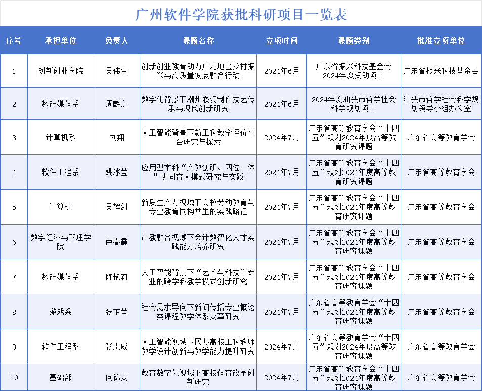 据悉,广州软件学院科普类项目“创新创业教育助力广北地区乡村振兴与高质量发展融合行动”获得广东省振兴科技基金会2024年度资助项目立项,资助经费3万元。数码媒体系周麟之老师主持的《数字化背景下潮州嵌瓷制作技艺传承与现代创新研究》获得2024年度汕头市哲学社会科学规划项目立项;《人工智能背景下新工科教学评价平台研究与探索》等8项课题立项为广东省高等教育学会“十四五”规划2024年度高等教育研究课题。