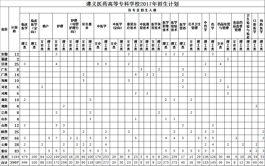 我校2017年招生计划总数为5000人,其中高考招生计划数3507人(省内3184人,省外323人)。高考各专业招生计划见下表: