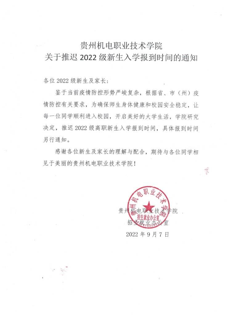 贵州机电职业技术学院 关于推迟2022级新生入学报到时间的通知
