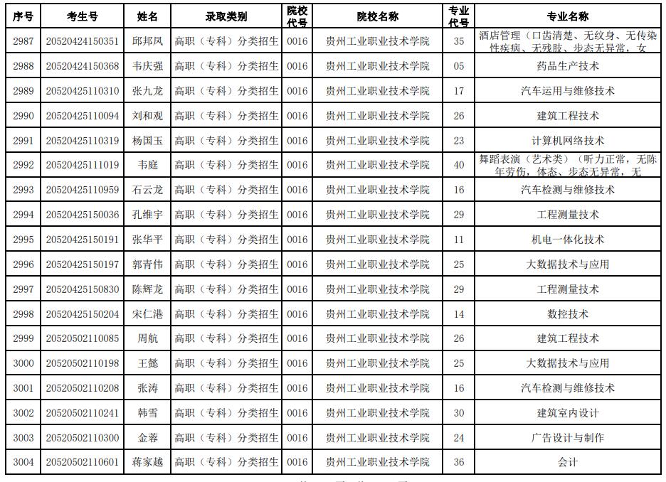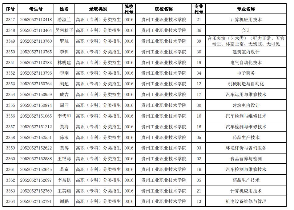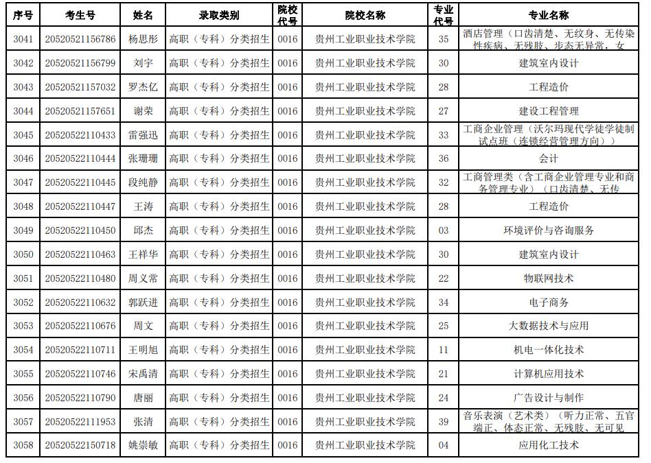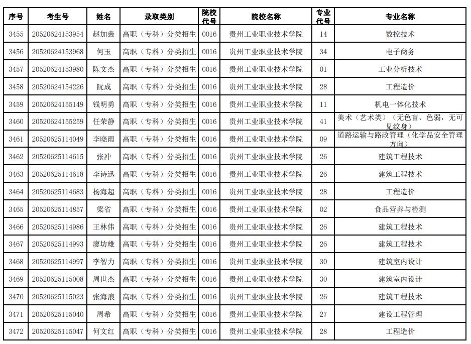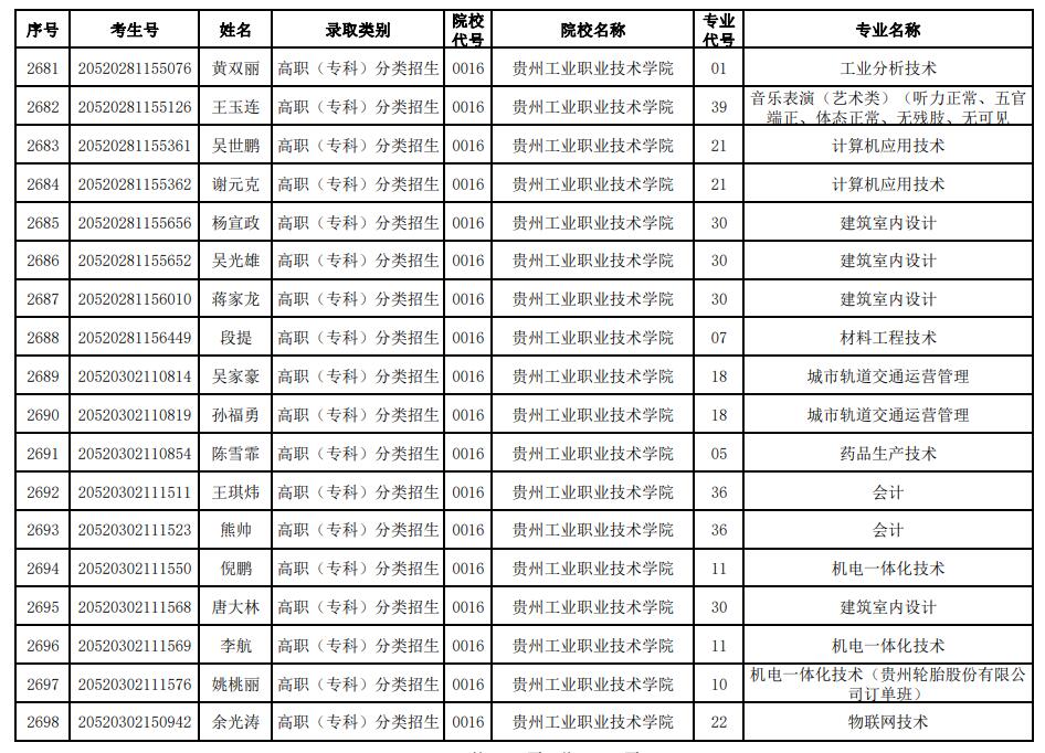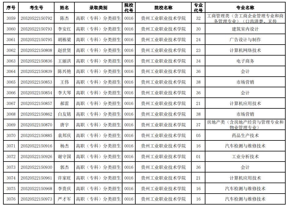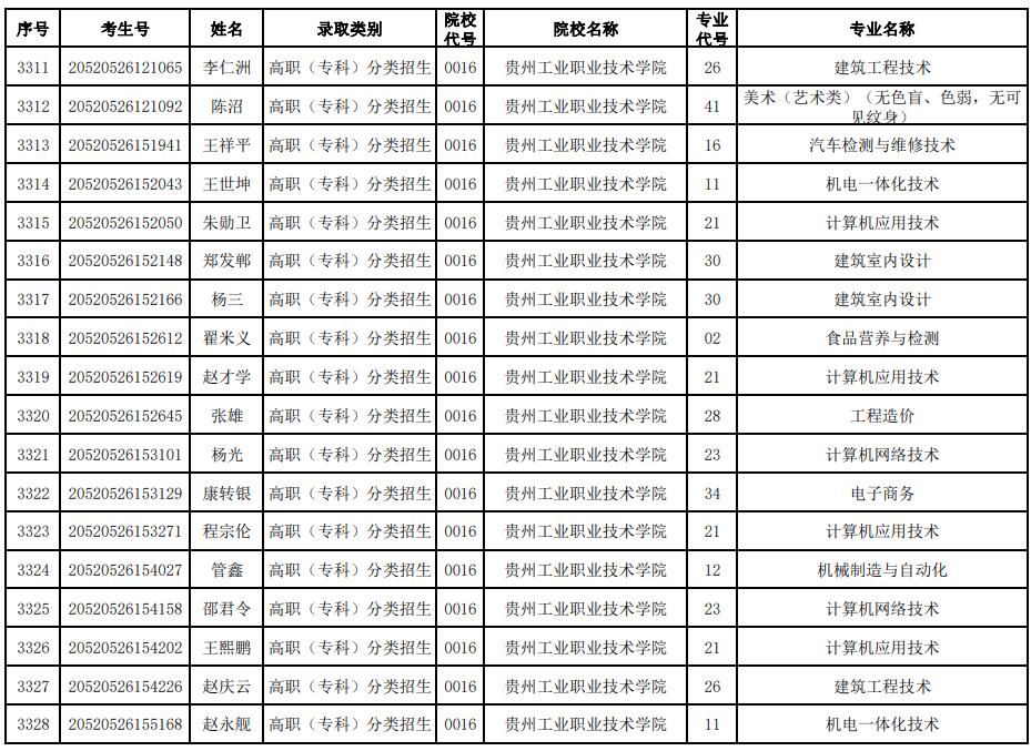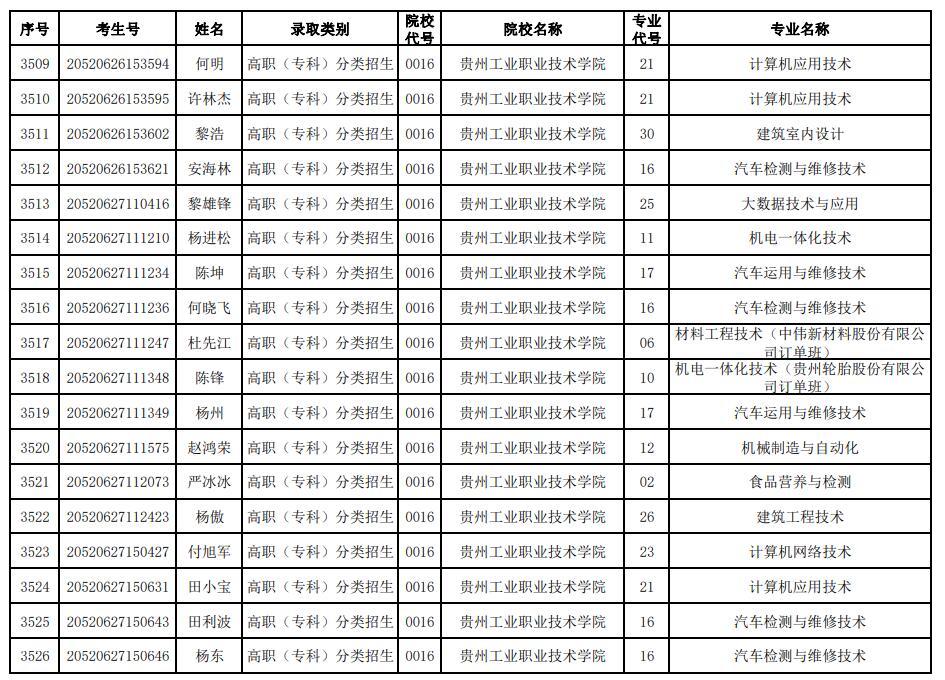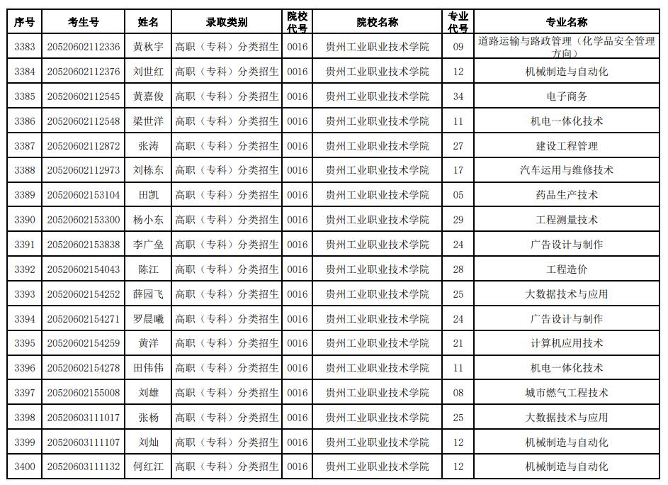 贵州工业职业技术学院2020年高职(专科)分类招生高中生预录取学生公示