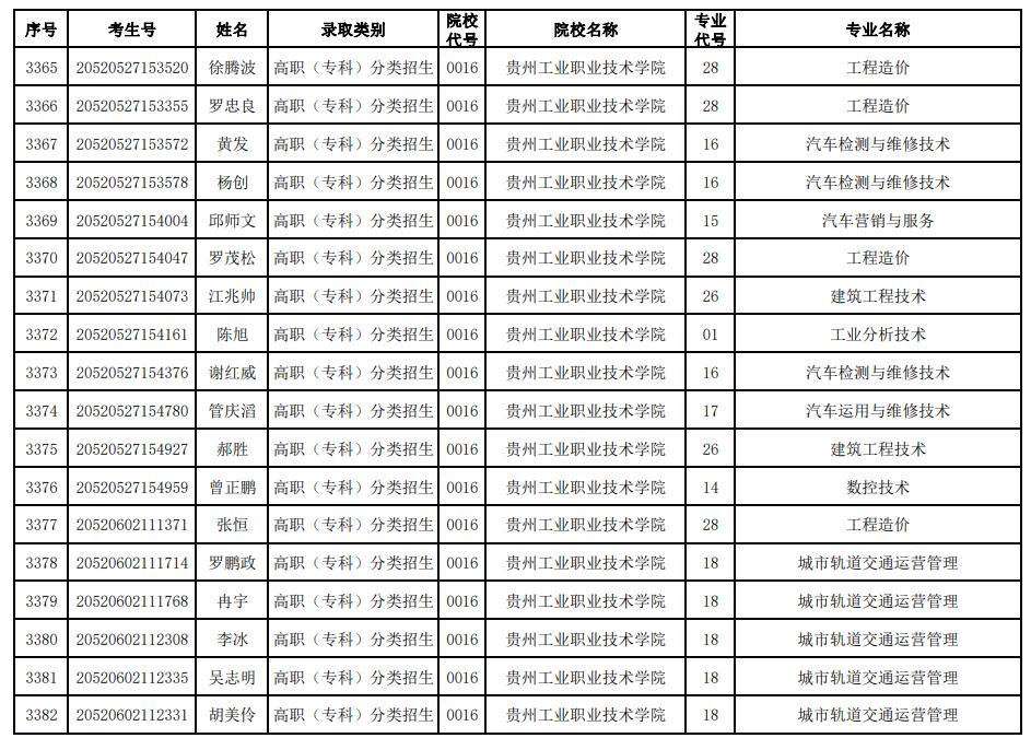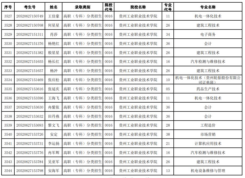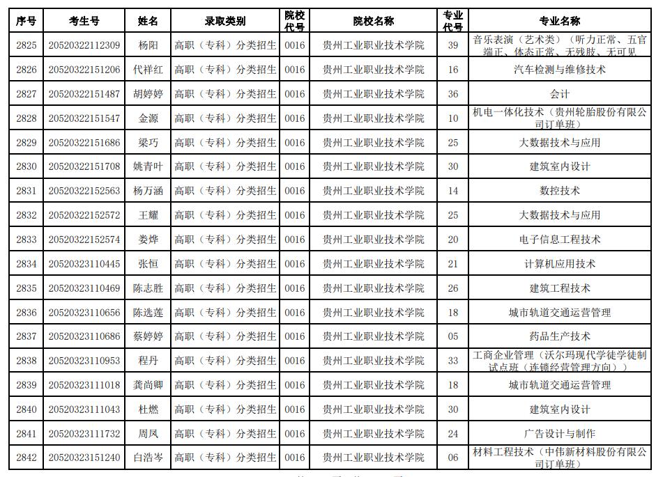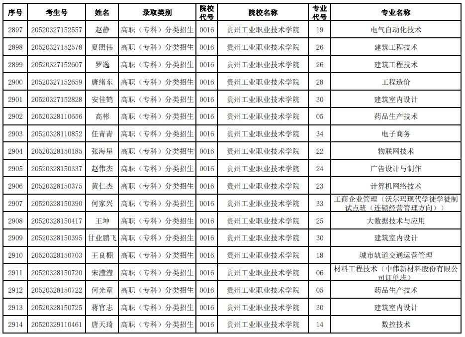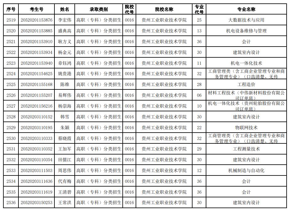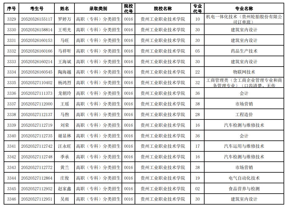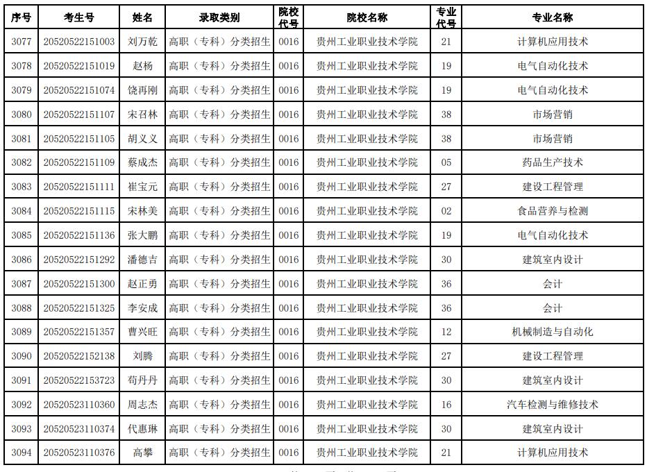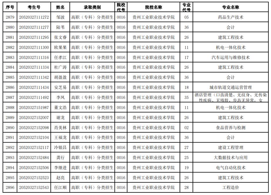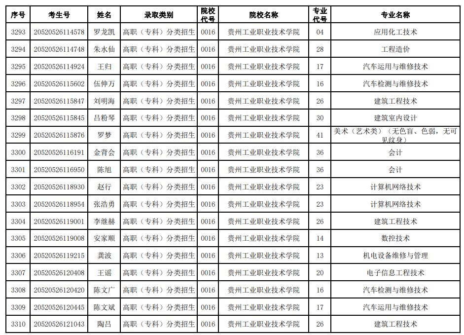 贵州工业职业技术学院2020年高职(专科)分类招生高中生预录取学生公示