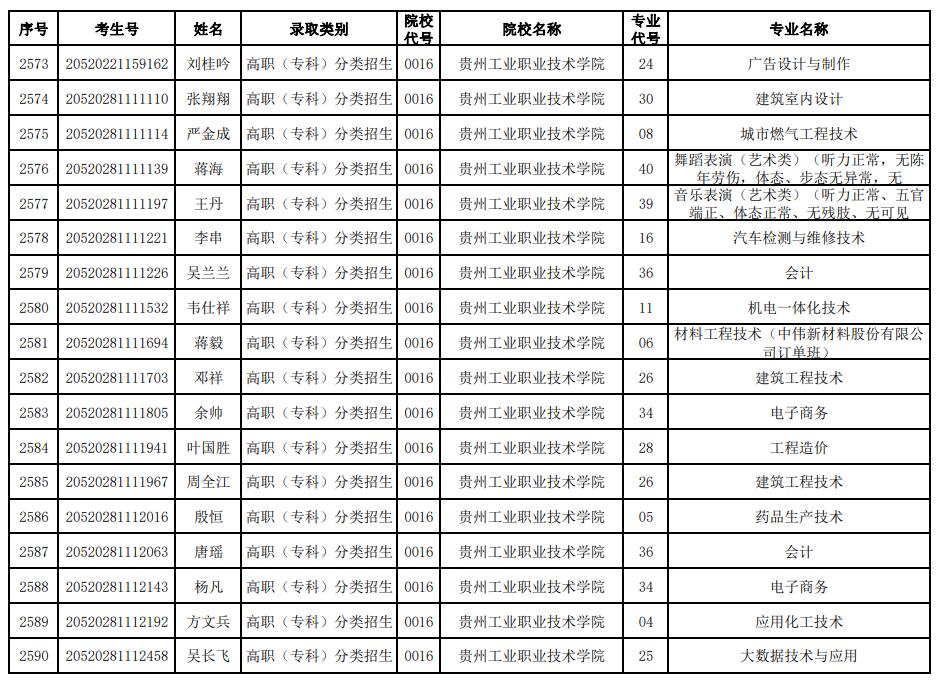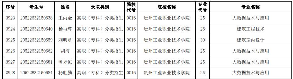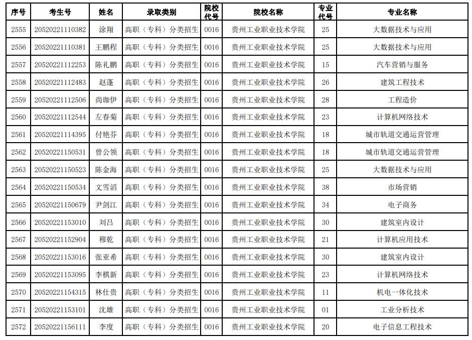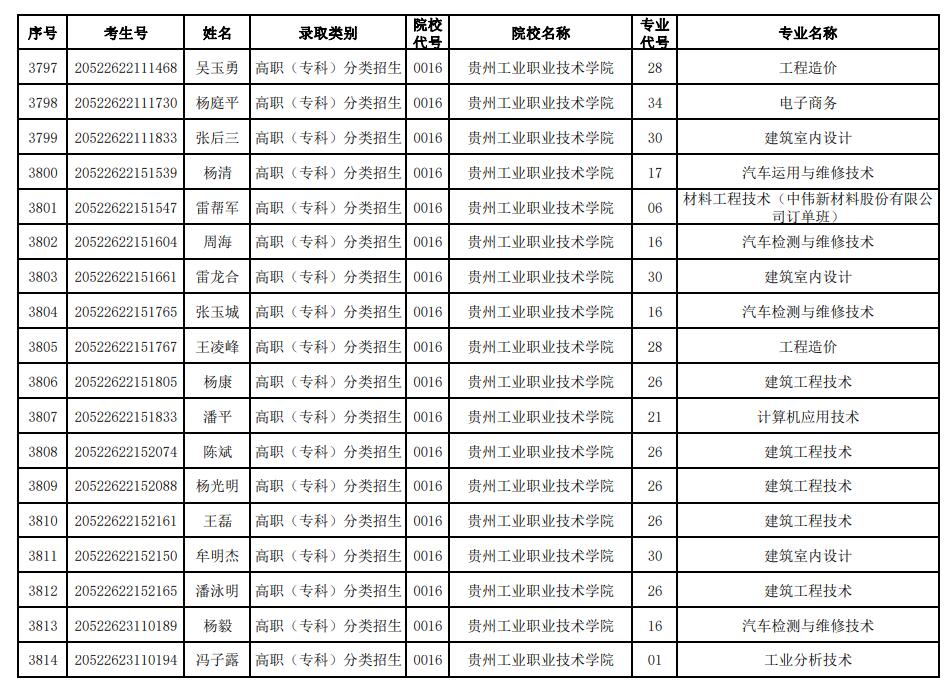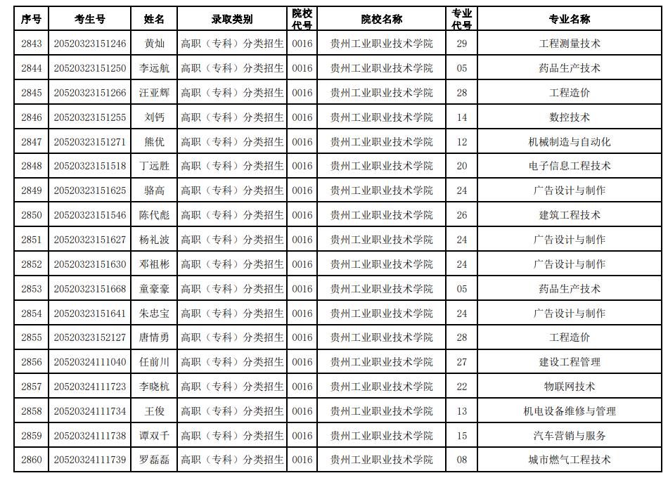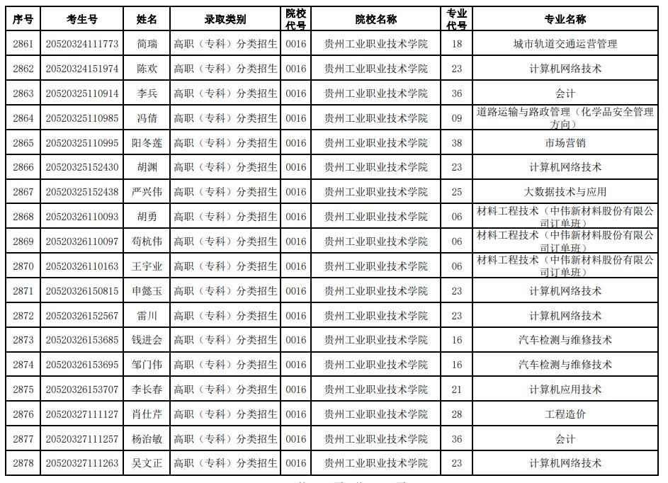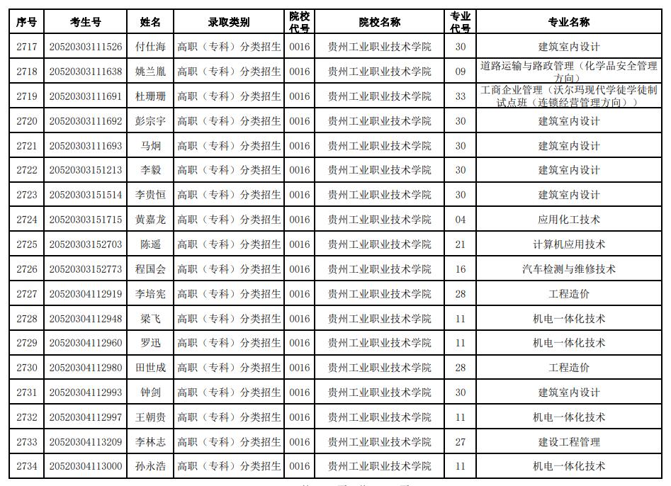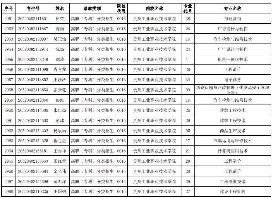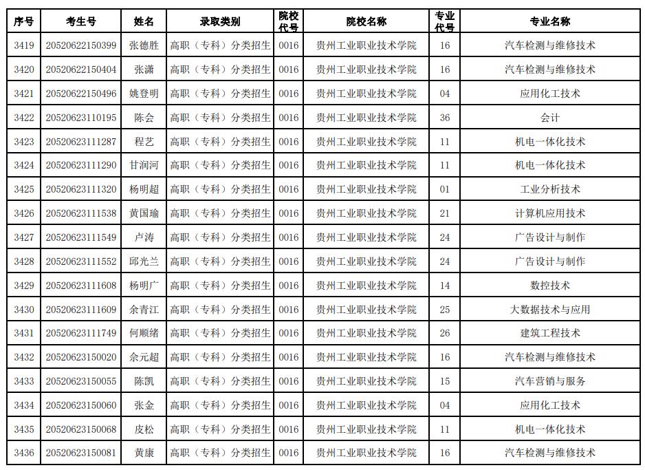 贵州工业职业技术学院2020年高职(专科)分类招生高中生预录取学生公示