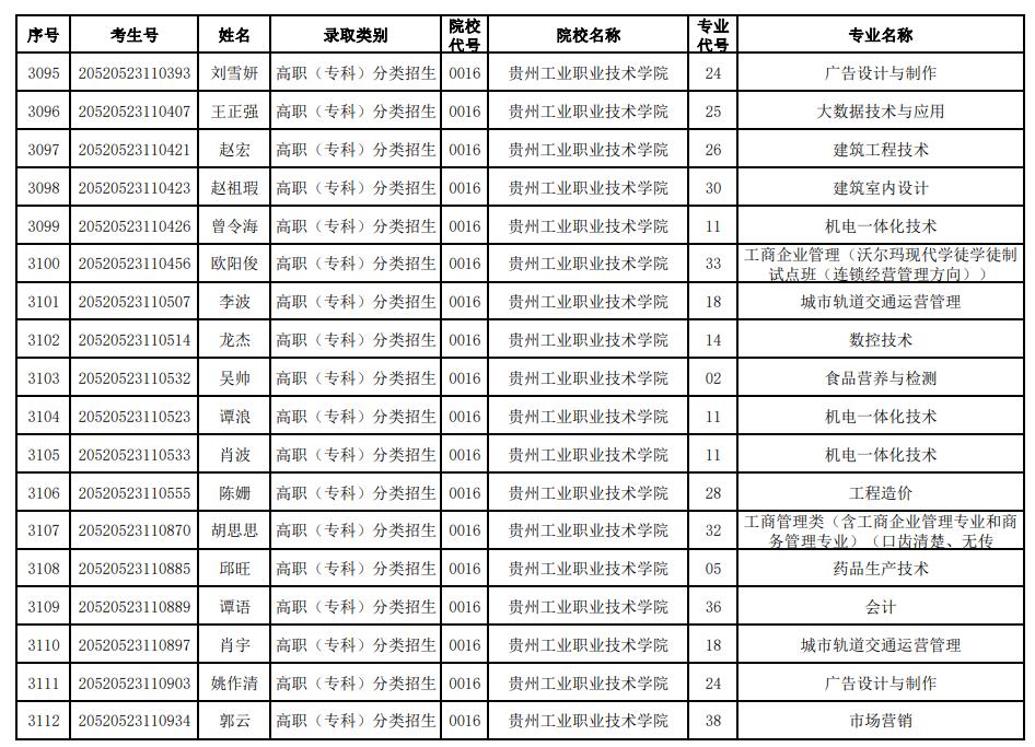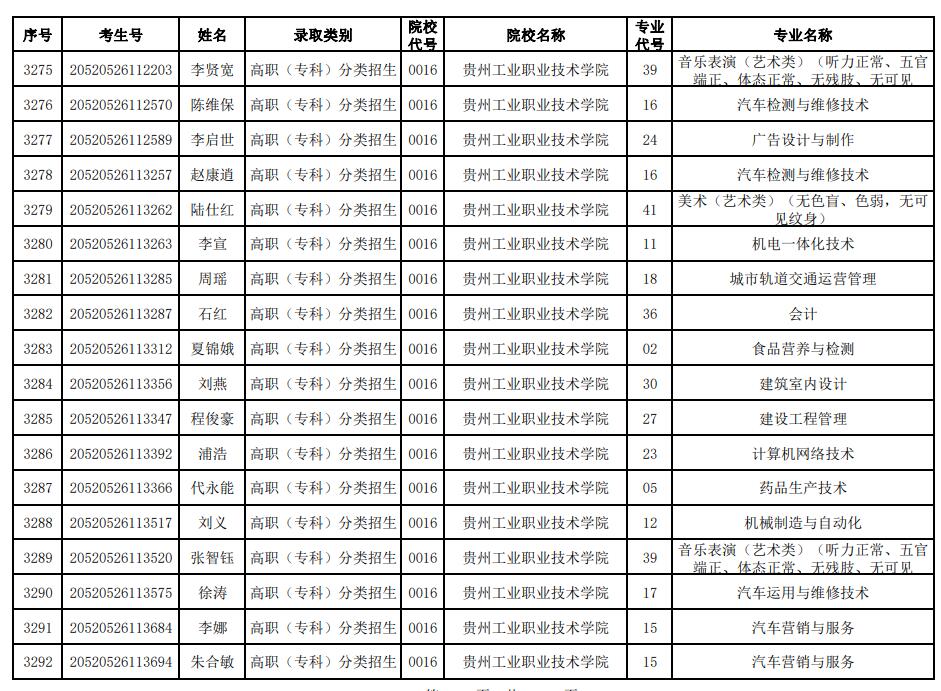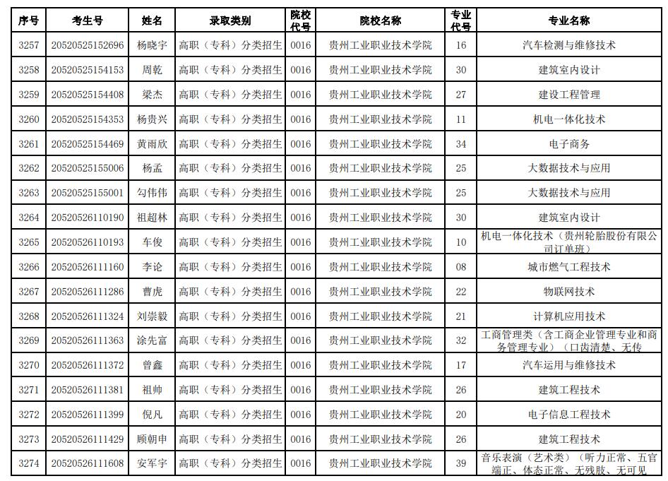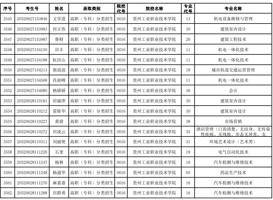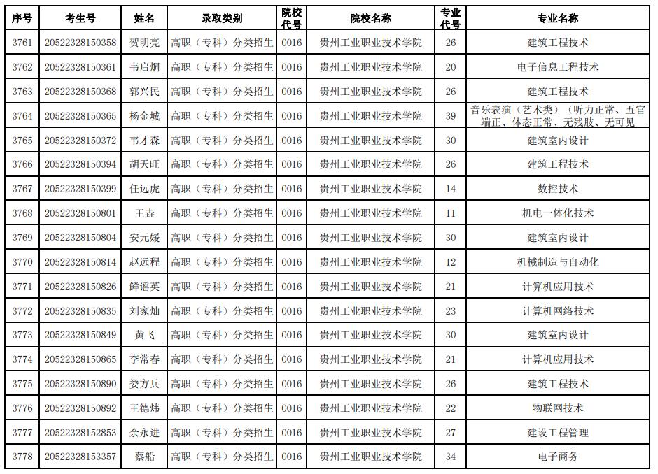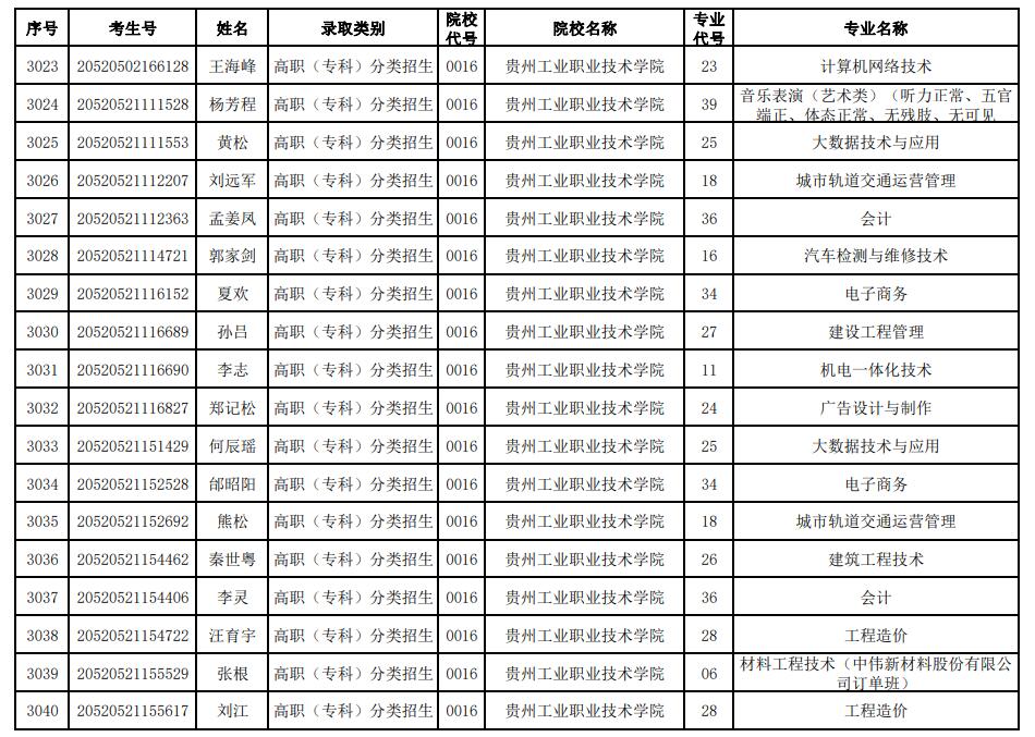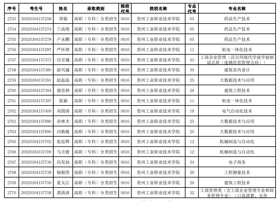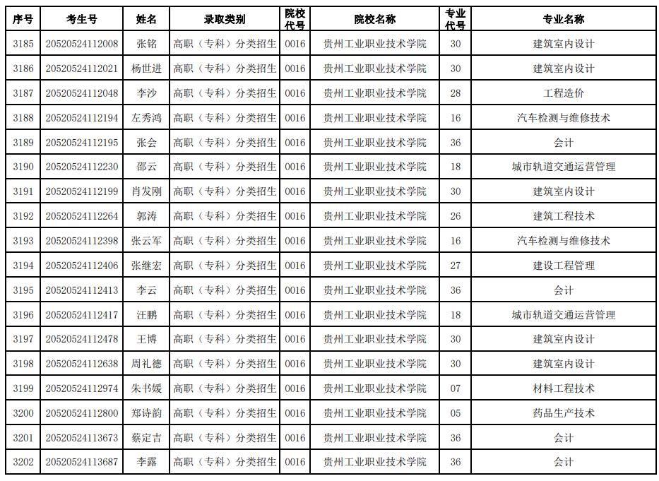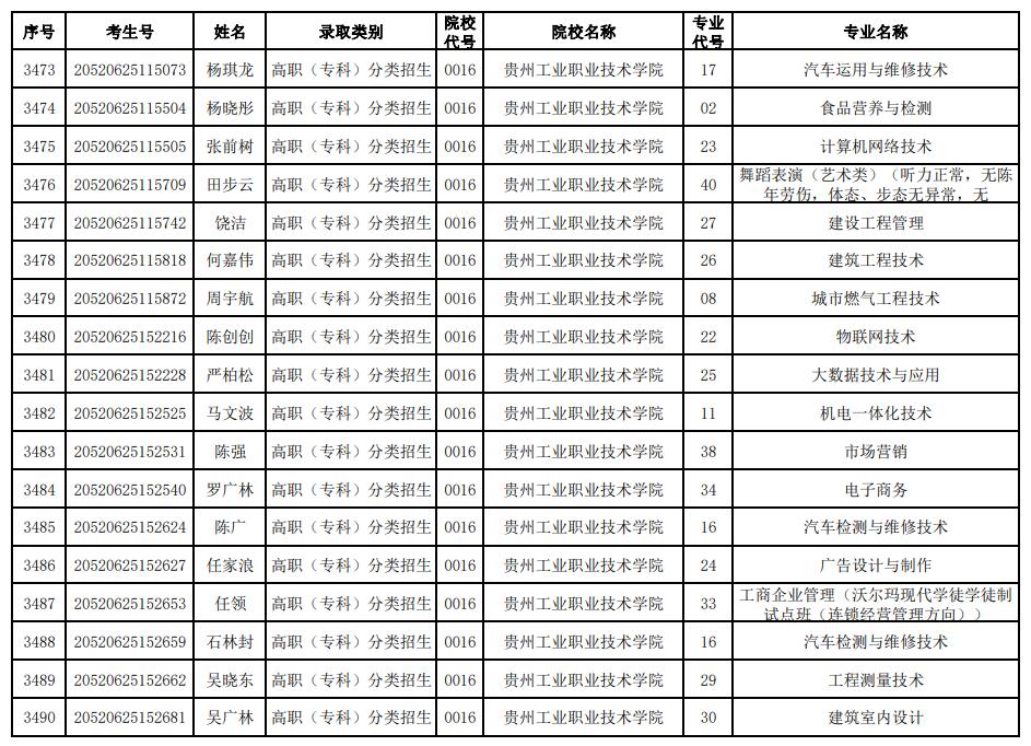 贵州工业职业技术学院2020年高职(专科)分类招生高中生预录取学生公示