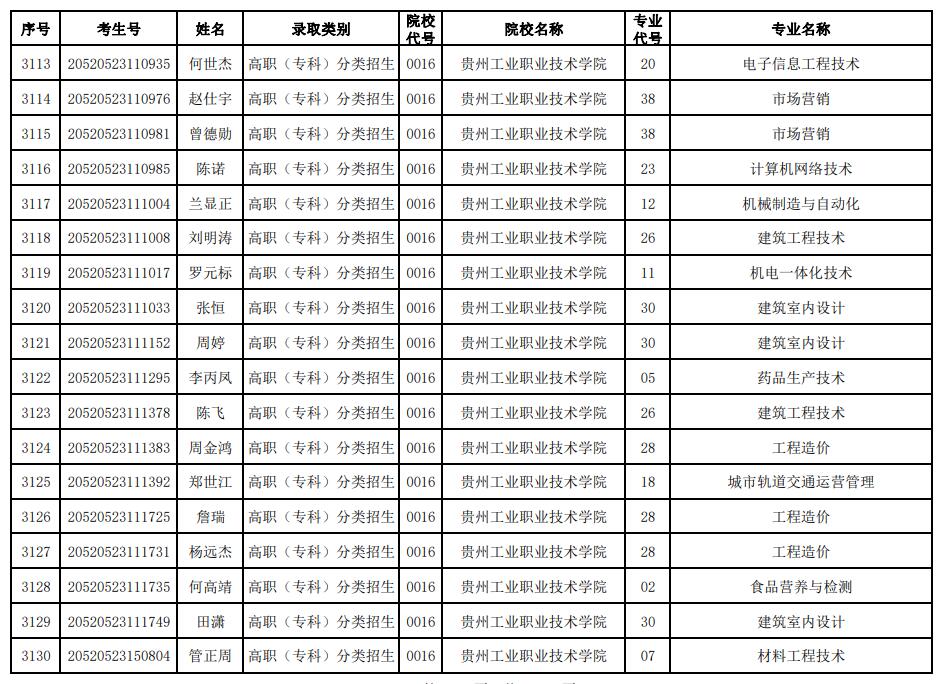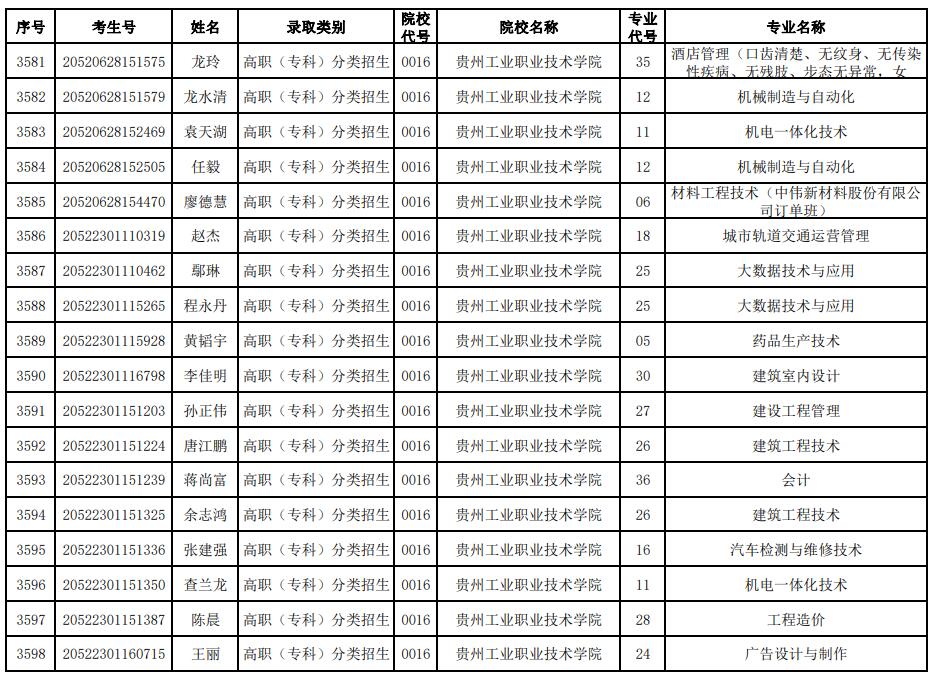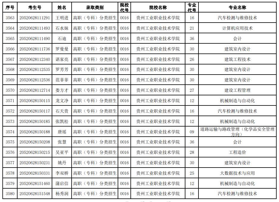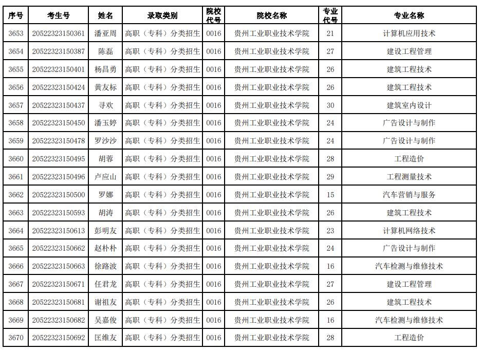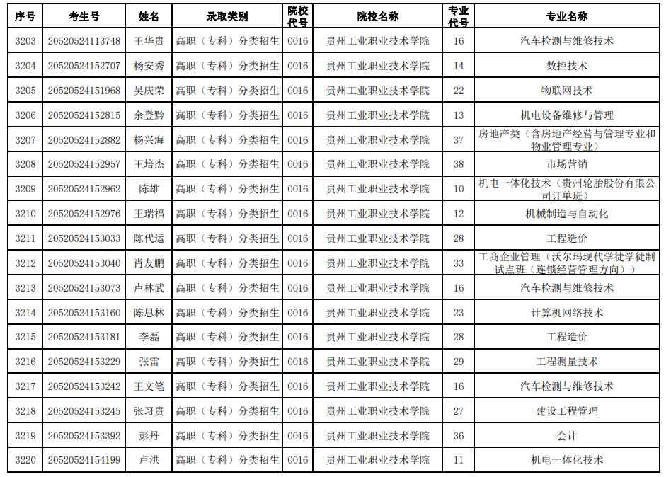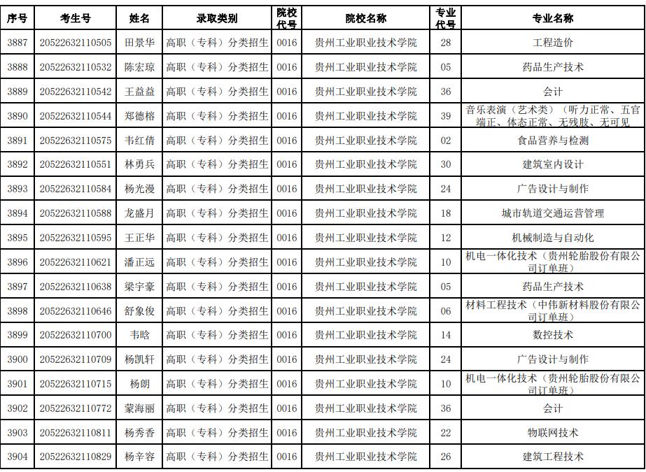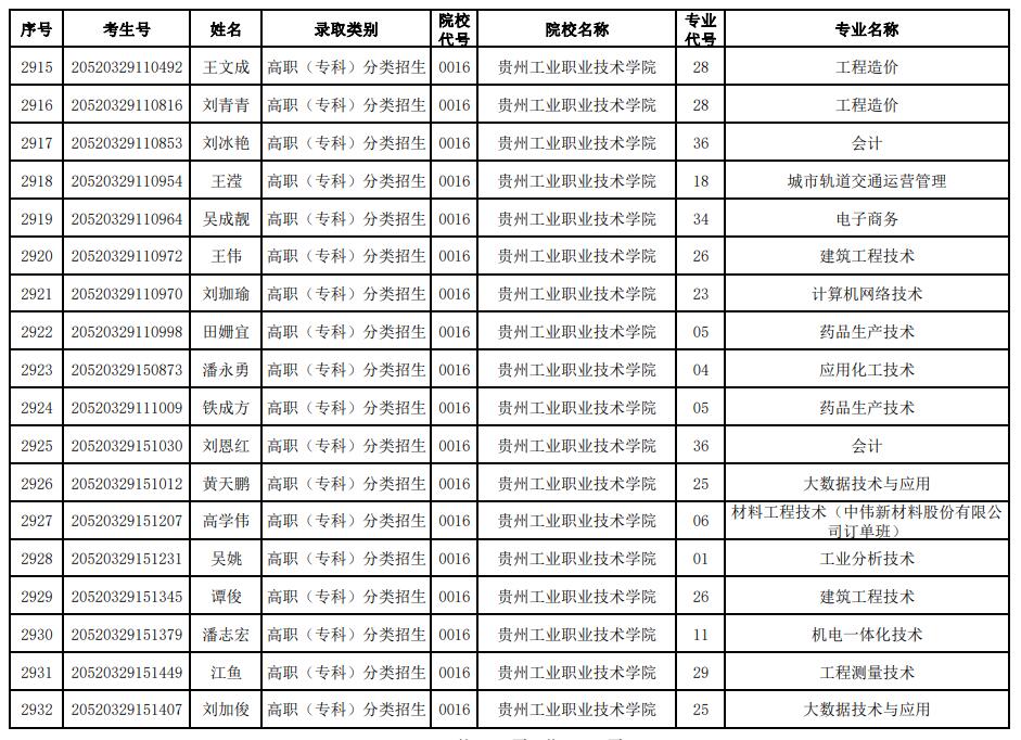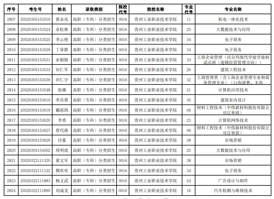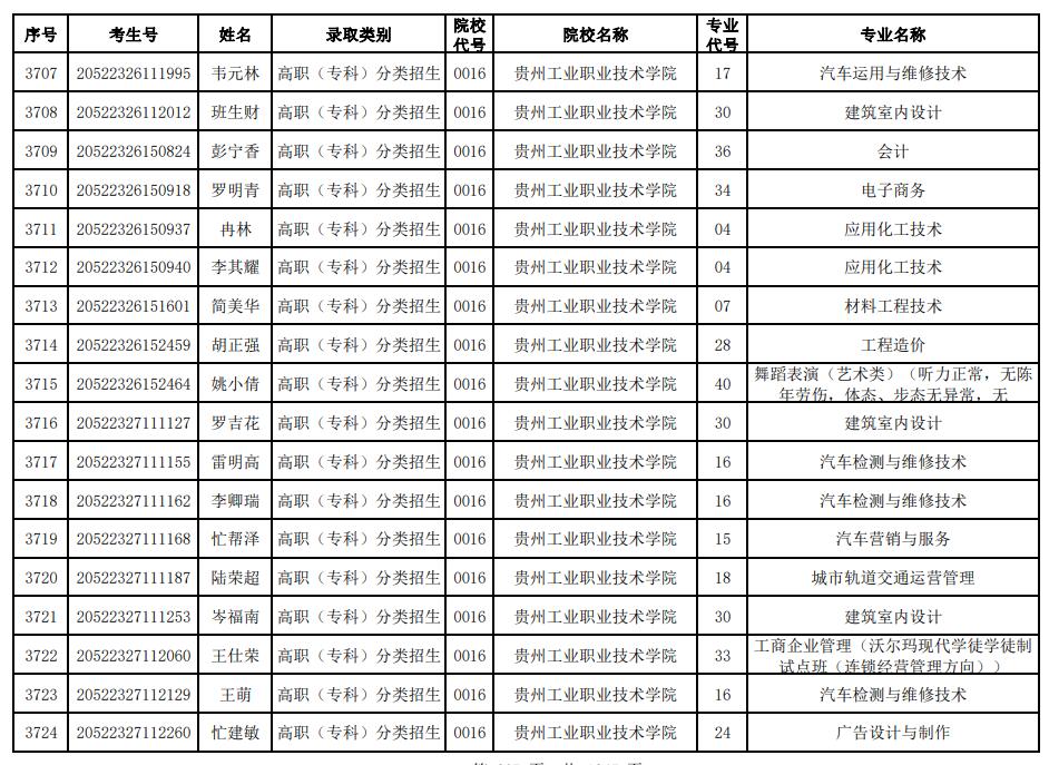 贵州工业职业技术学院2020年高职(专科)分类招生高中生预录取学生公示
