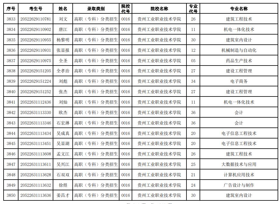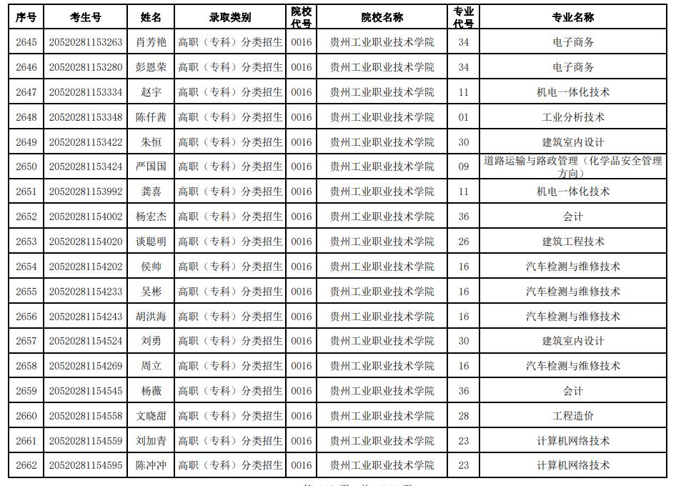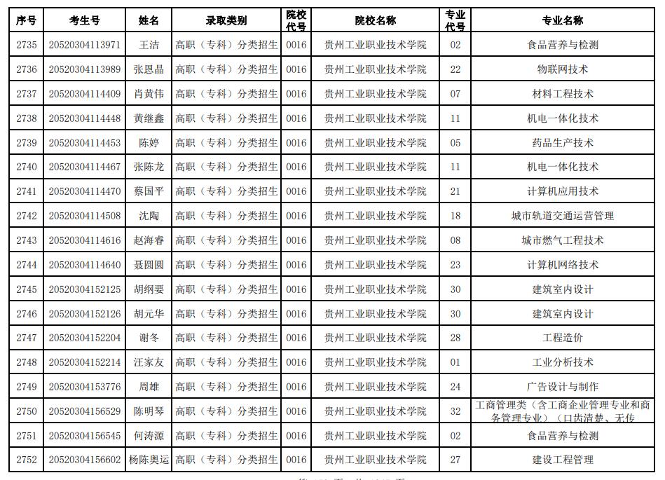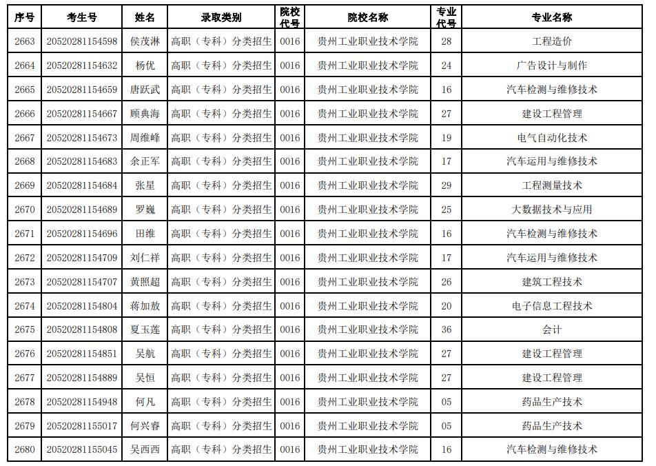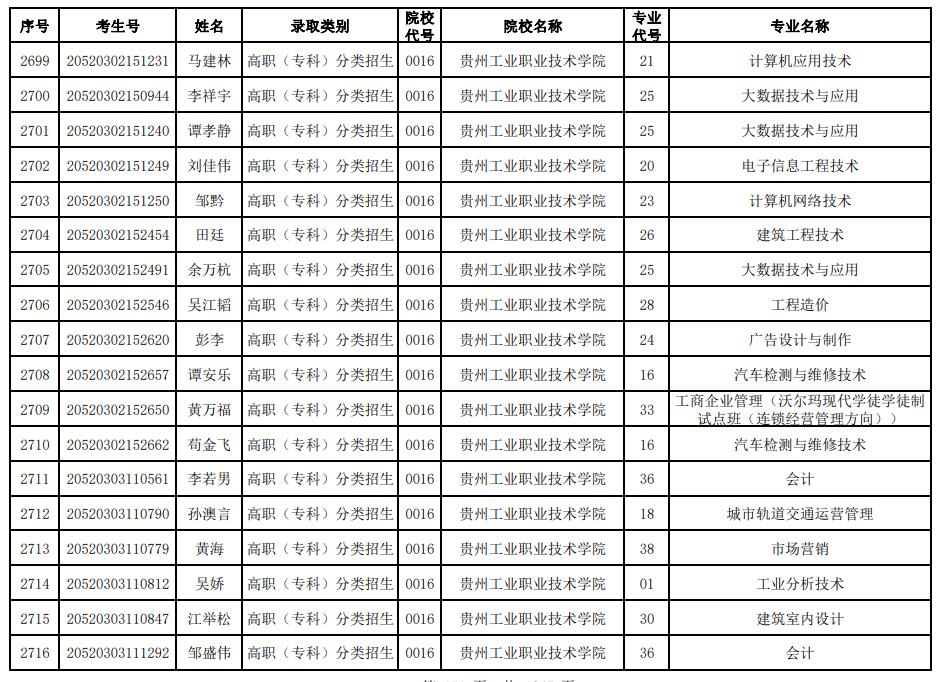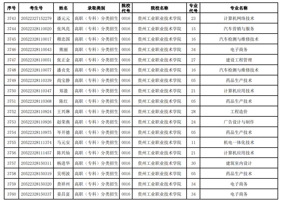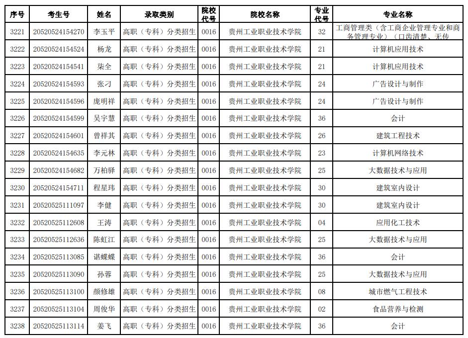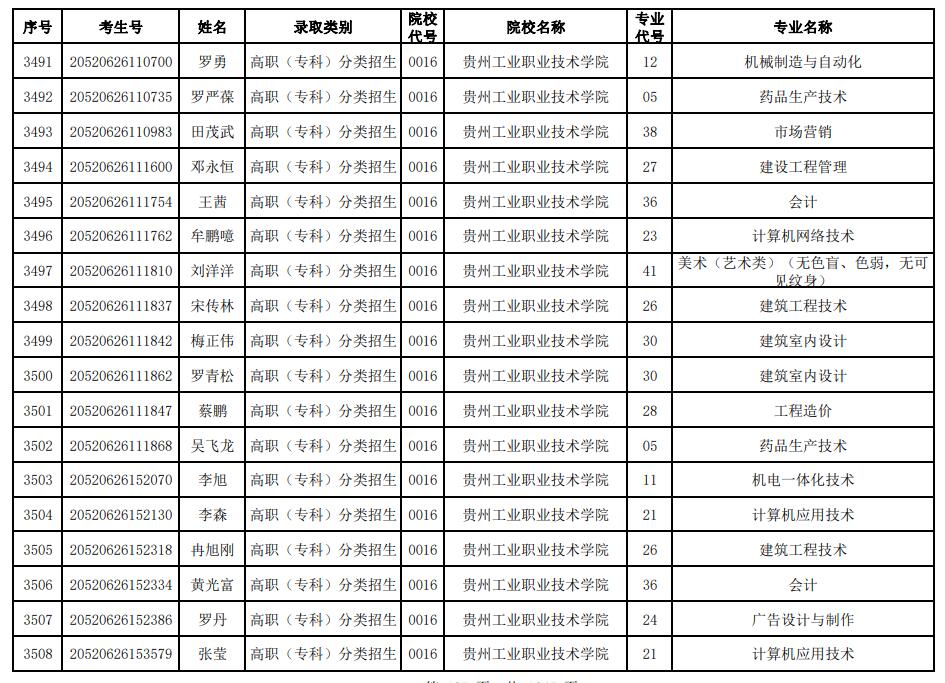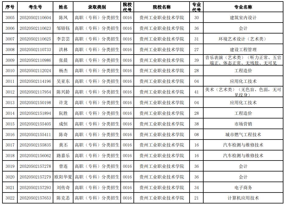 贵州工业职业技术学院2020年高职(专科)分类招生高中生预录取学生公示
