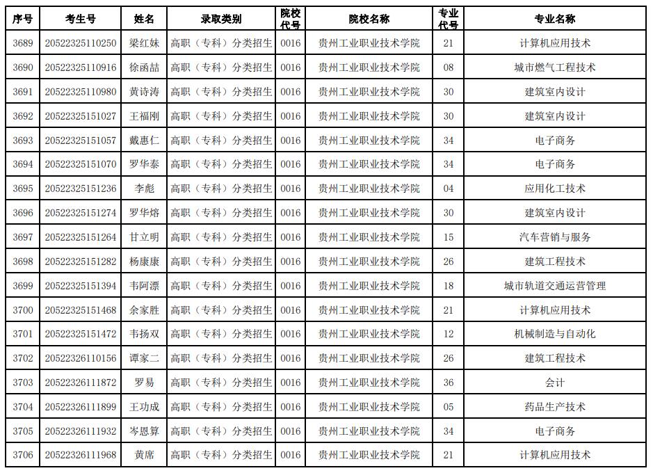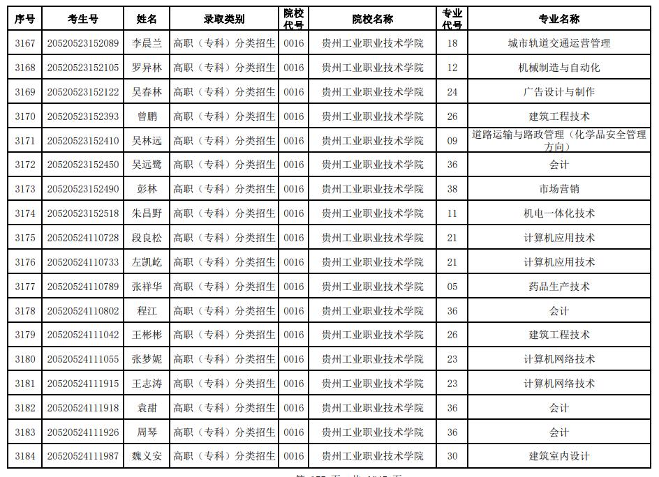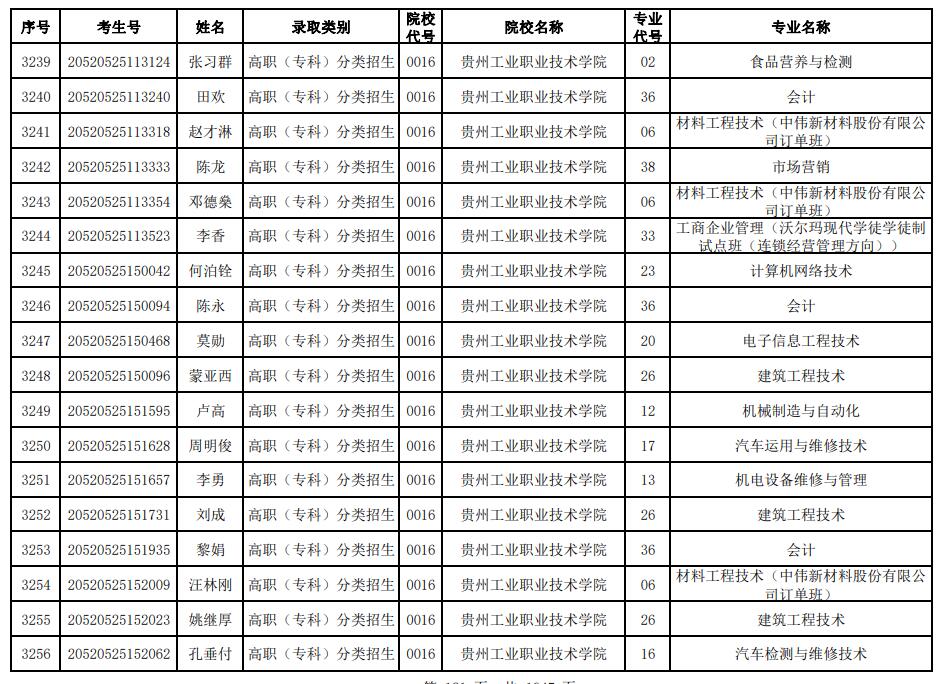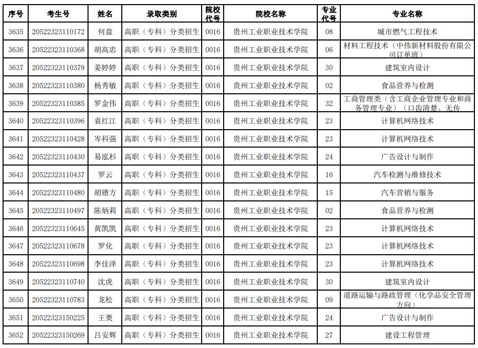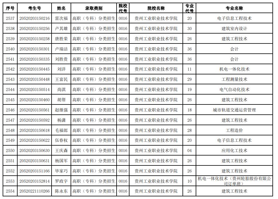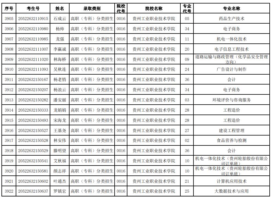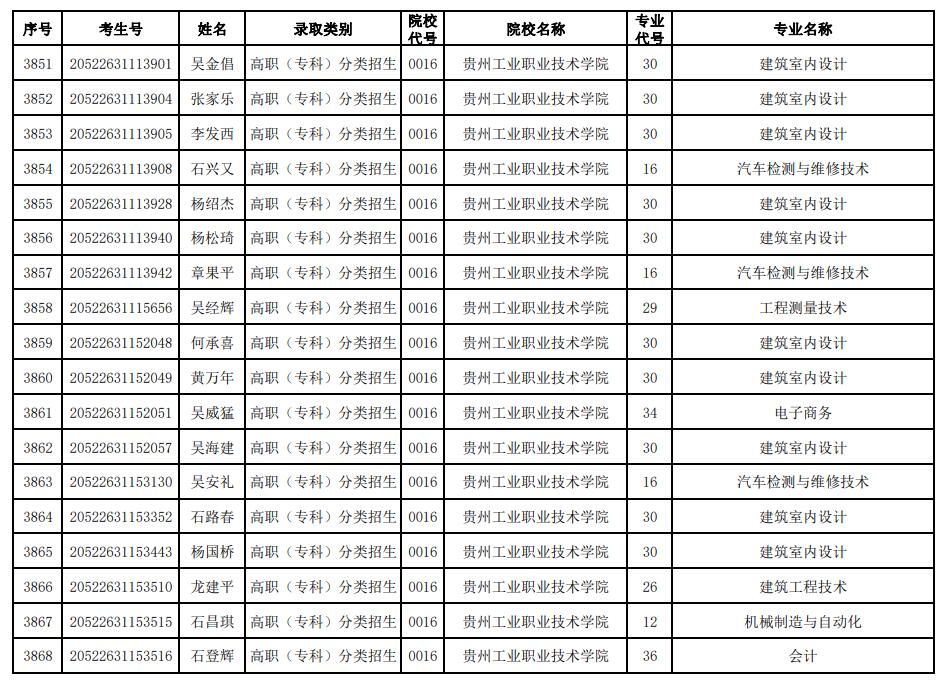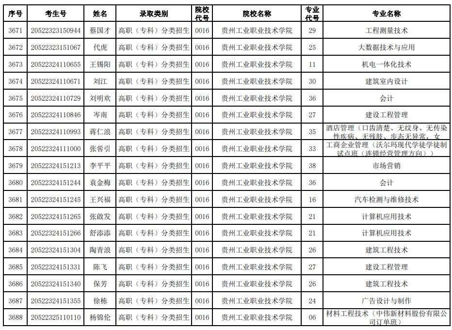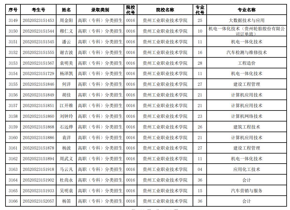 贵州工业职业技术学院2020年高职(专科)分类招生高中生预录取学生公示