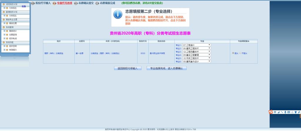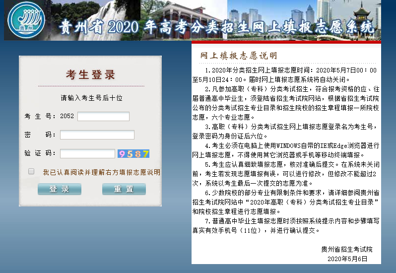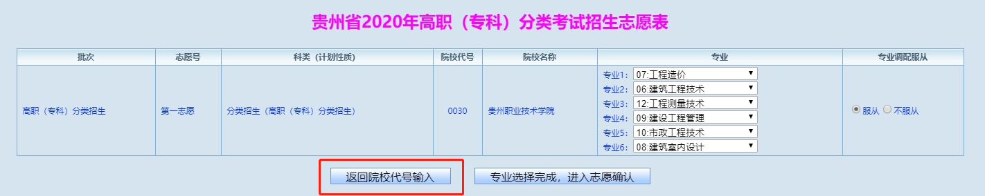 6.少数院校的部分专业有限制条件和要求,请详细参阅贵州省招生考试院网站中“2020年高职(专科)分类考试招生专业目录”和院校招生章程进行志愿填报。