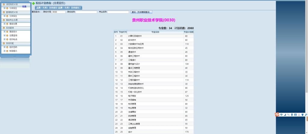 考生点击“查询院校计划”列表下的科类名称,进入院校计划查询页面。考生可以输入院校代号、或者院校名称和专业名称查找要报考的院校和专业。系统支持模糊查询,例如在学校代码中输入“0030”,可显示贵州职业技术学院所有的招生专业信息。(图-4)