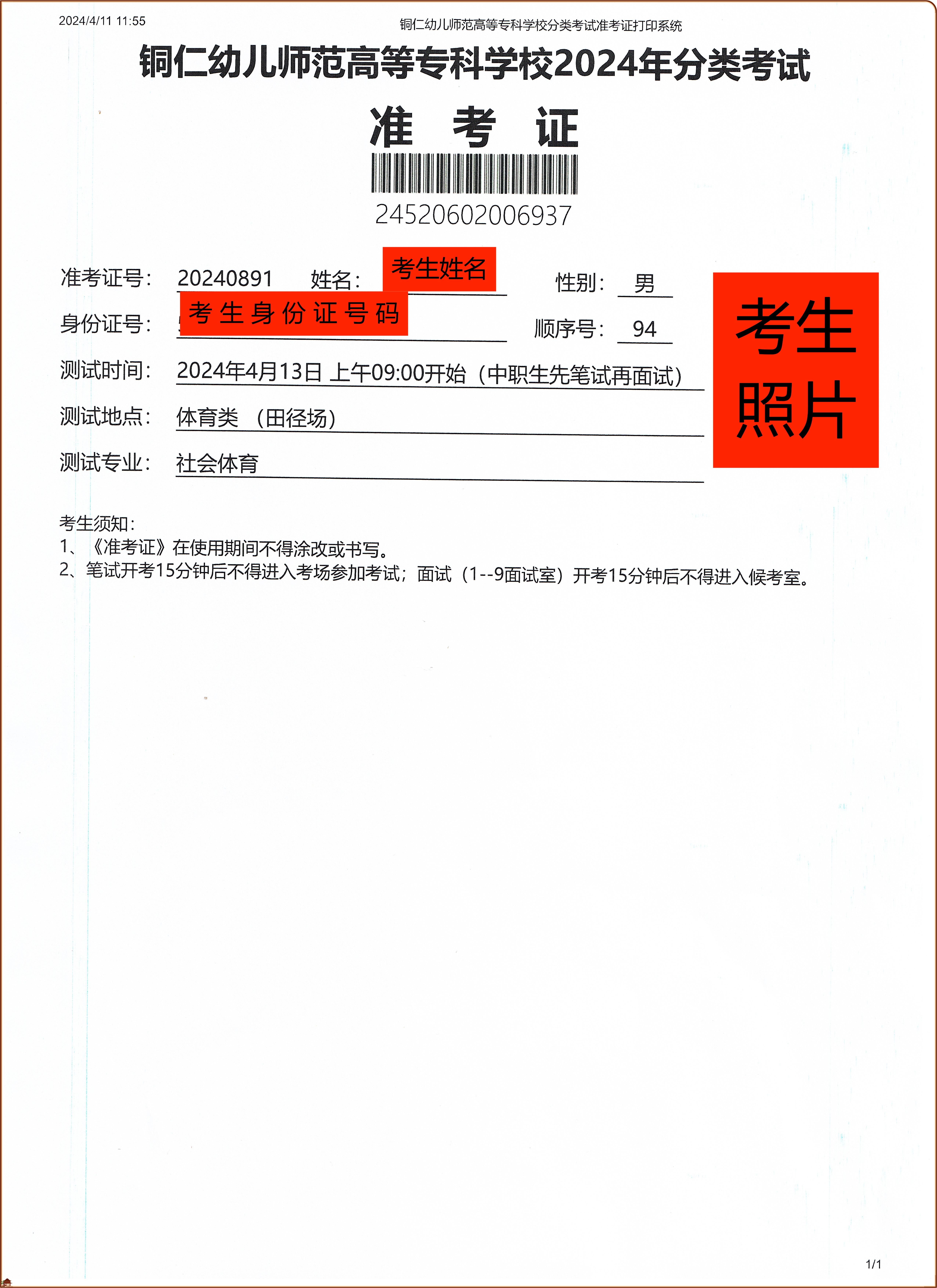 (中职类考生准考证图)