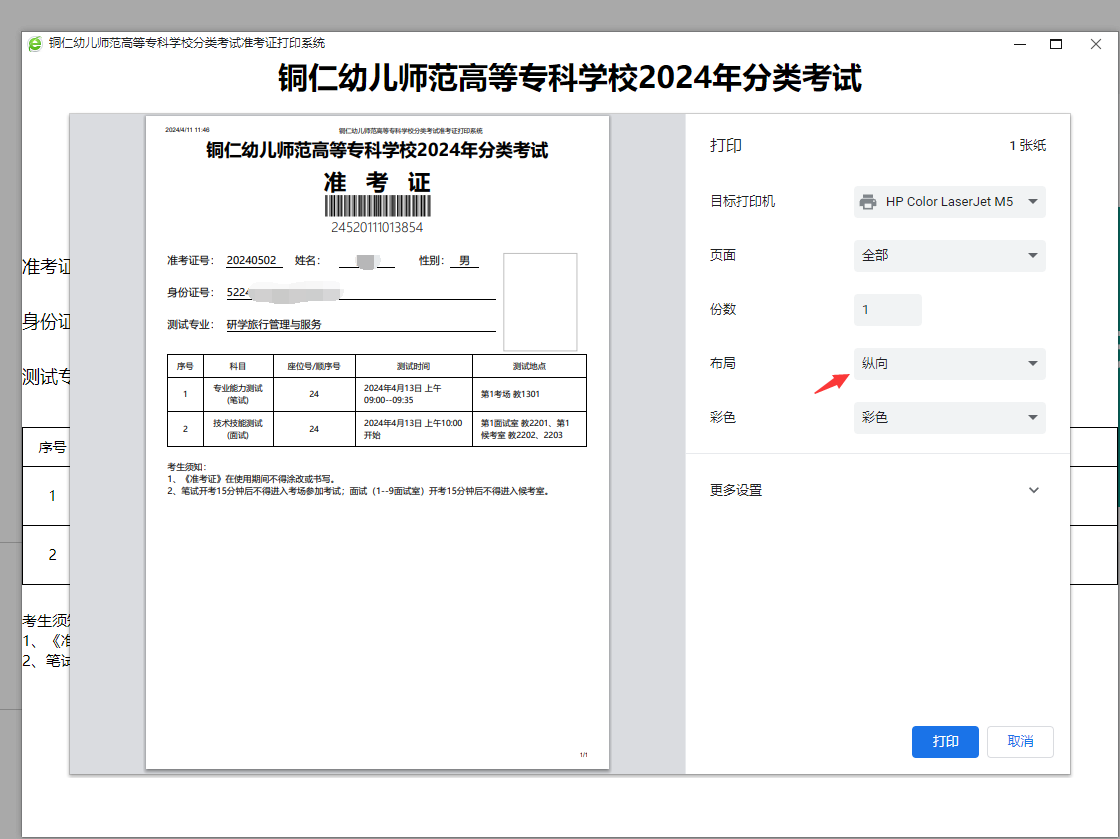 4.按照本次准考证打印系统的提示,设置为A4纸张、纵向打印。