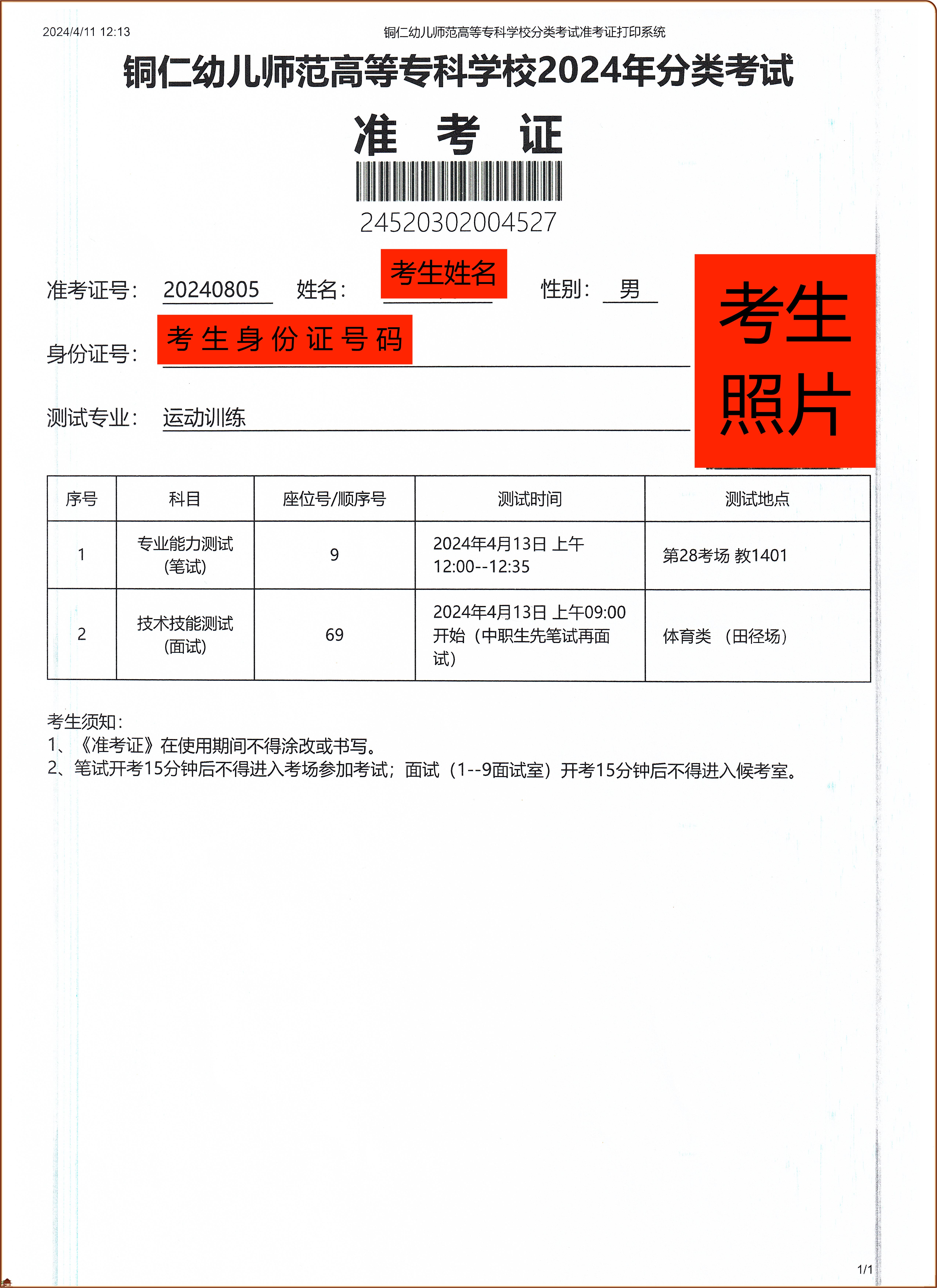 2.体育类专业考生在2024年4月13日(星期六)9:00开始测试,具体考试时间以准考证为准,迟到15分钟不得参加我校组织的考试。