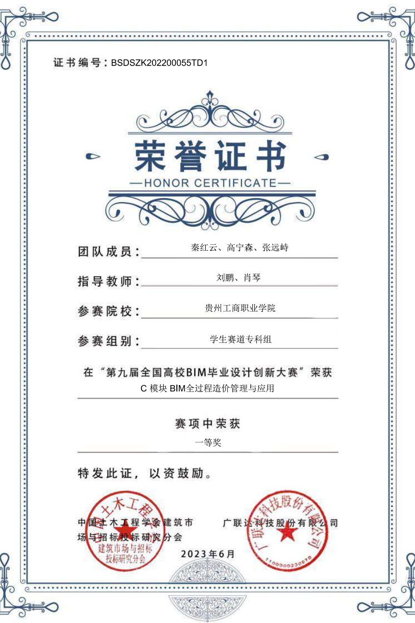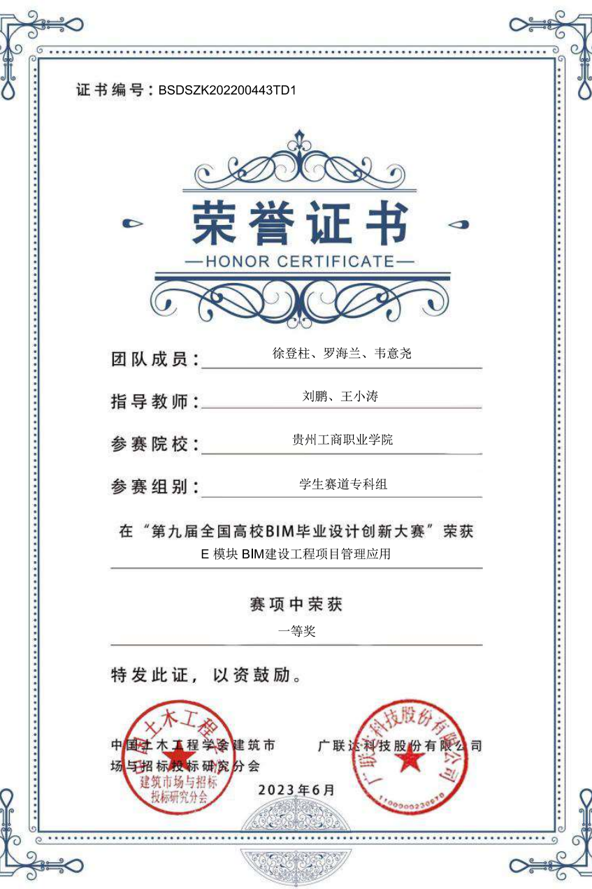 ·深圳市BIM技术建模及算量大赛三等奖;贵州工商职业学院第一届测量大赛二等奖等。