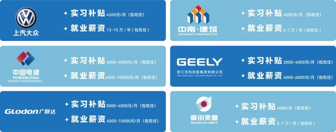 School-enterprise cooperation近年来工程学院毕业去向落实率稳定在 98% 以上,专业对口毕业去向落实率达 85% 以上,与中国电建集团、浙江吉利控股集团等37家名优企业深化合作,通过校企共建双元开发,开设名企就业班,提高了学生专业技术能力和工作岗位的胜任力,其中,建筑信息模型英才班、吉利名企就业班毕业去向落实率达 100%。
