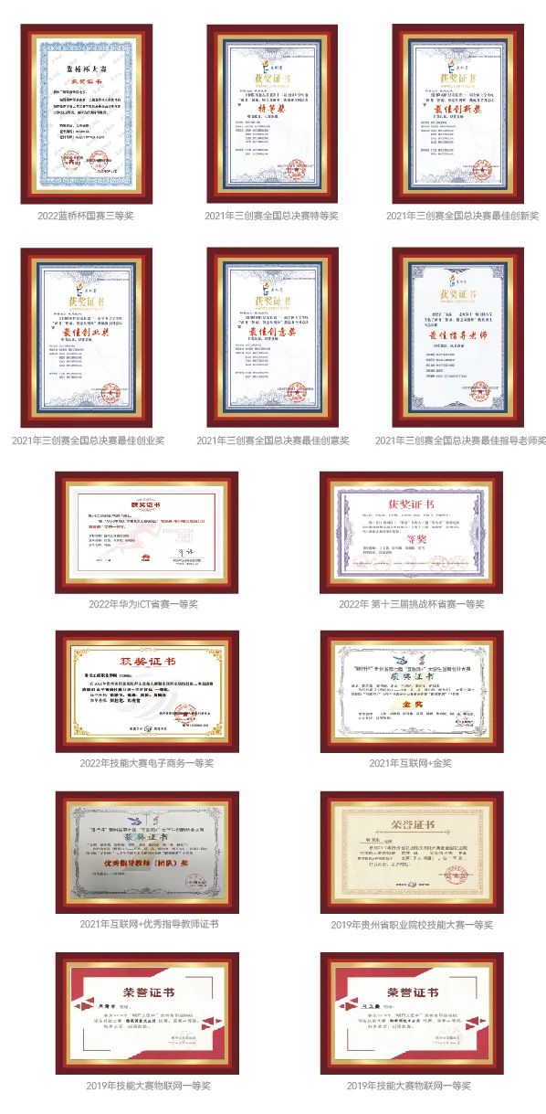 “黔货出山,乘风破浪”直播团队更是创下第十一届全国大学生电子商务“创新、创意及创业”大赛贵州院校历届最好成绩——贵州高职院校第一次获三创赛国赛特等奖和“大满贯”。华为ICT大赛2022-2023省赛一等奖,全国总决赛三等奖,共促高校ICT人才培养,打造ICT人才生态。