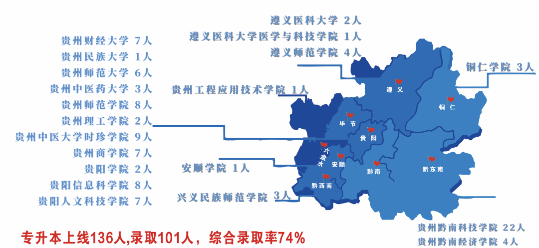 2023年贵州省普通高等学校专升本考试中,经济与管理学院应届毕业生101人分别被贵州财经大学、贵州师范大学、贵州民族大学、贵州中医药大学、遵义医科大学等20所本科院校录取,录取率为74%,创历史新高。