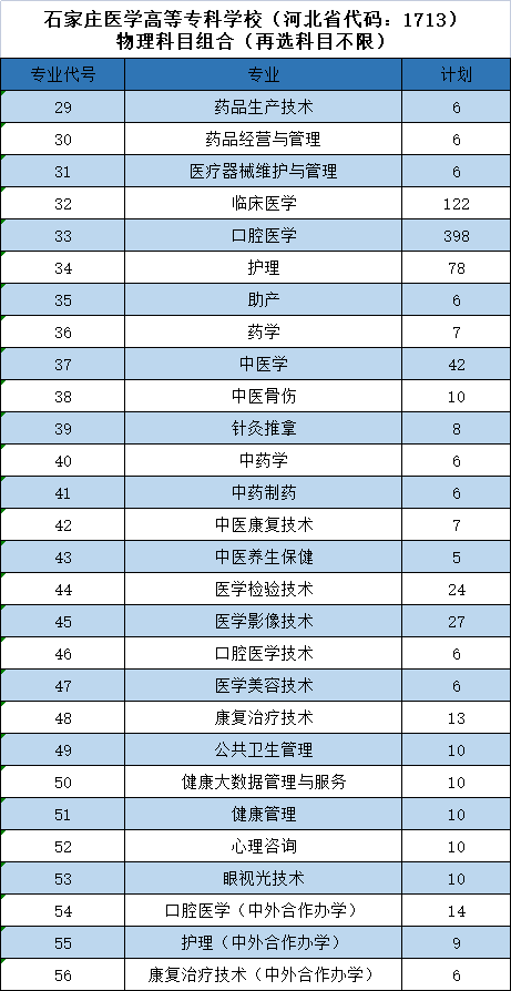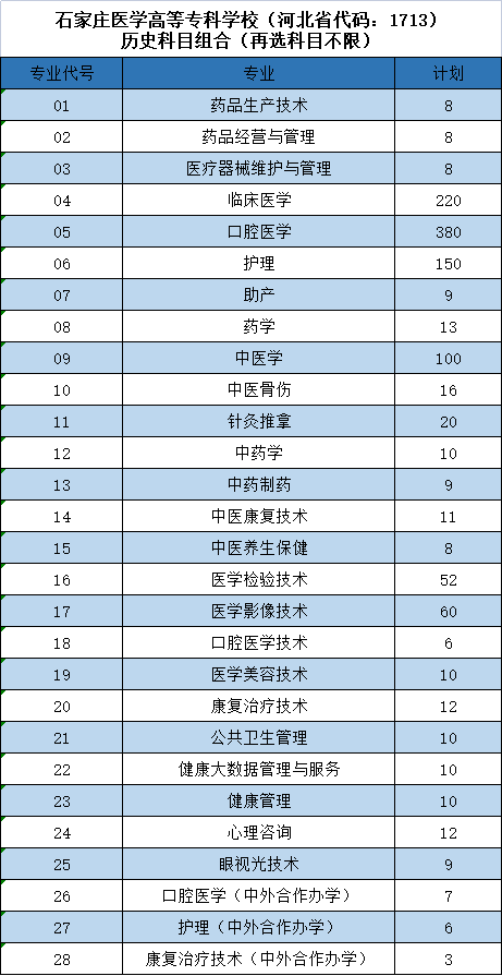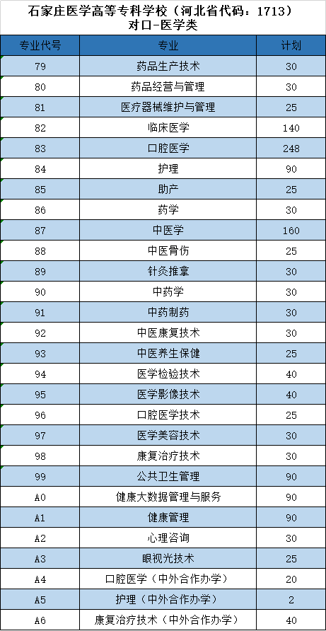 石家庄医学高等专科学校代码:1713(河北省考生使用),各专业代码见下表:
