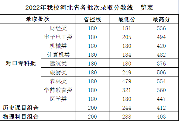 2022年我校河北省各批次录取分数线一览表