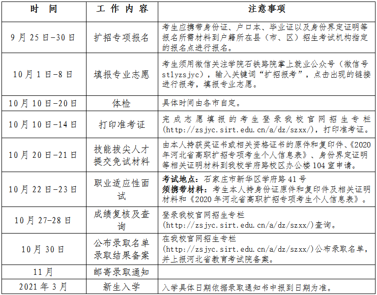 一、学校简介 石家庄铁路职业技术学院是一所具有优良传统的省属公办全日制普通高校。2010年5月,被确定为国家示范性高等职业院校;2019年7月,被确定为国家优质高等职业院校;2019年12月,成功入选“中国特色高水平高职学校和专业建设计划”高水平专业群建设单位。 学院始建于1950年9月,前身为中国人民解放军铁道兵工程学院财务材料系;1984年1月并入铁道部,同年6月,改为石家庄铁道学院中专部;1993年1月改建为石家庄铁路工程学校,1994年1月独立办学,隶属于中国铁道建筑总公司;2000年7月改建升格为石家庄铁路工程职业技术学院;2003年9月更为现名;2005年8月移交河北省人民政府管理;是教育部首批现代学徒制试点单位、首批职业院校数字校园建设实验校、首批国家职业院校文化素质教育基地建设单位、教育部-讯方产学合作协同育人项目ICT师资培训基地。 二、报考条件 1.已报名参加河北省2020年高职扩招专项招生考试的退役军人; 2.报考铁道工程技术、工程测量技术专业的考生要求无色盲、色弱。 3.已参加2020年普通高校招生报名的考生,不再参加此次专项报名。 4.参加此次扩招专项报名并被高职院校录取的考生,不再参加2021年普通高考报名。