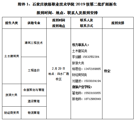 附件1:石家庄铁路职业技术学院2019级第二批扩招新生报到时间、地点、联系人及报到安排