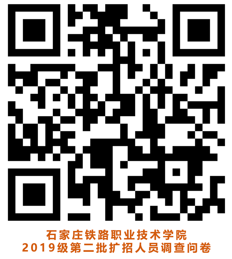 一、报到时间、地点及要求 入学新生持《录取通知书》、身份证、准考证按录取专业对应时间、地点报到,切勿提前报到。因故不能报到者,须向联系人请假,未请假或请假超过两周仍未报到者取消其入学资格。具体报到时间及地点:请仔细阅读附件1《石家庄铁路职业技术学院2019级第二批扩招新生报到时间、地点、联系人及报到安排》。二、新生缴费 学校依据河北省物价局批复,收取学费,标准如下: 1.学费:退役军人按照相关文件执行,暂缓缴纳。 2.食宿费、交通费:集中授课期间自行安排,费用自理。三、校园卡办理 新生报到,首先到学院后勤管理处办理校园卡。新生领卡后缴费激活卡片,再到各系进行报到和学籍注册。校园卡功能包括学籍信息管理、考务管理、图书借阅管理、食堂和超市就餐消费、洗浴和饮用水消费等。校园卡实行一人一卡制。四、新生体检按教育部《普通高校学生管理规定》,新生入学后要进行体检复查。具体安排另行通知。五、资助政策 贫困生资助按照国家相关文件执行。六、填写高职扩招调查问卷 为方便学院了解高职扩招专项考试录取新生情况,请扩招新生扫描二维码填写此问卷。