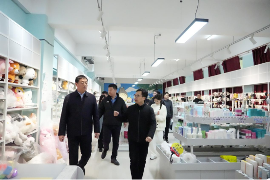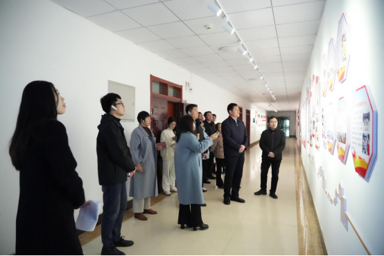 在高燕院长的陪同讲解下,尹部长一行人先后参观了基地特色文化墙、基地活动室、电商直播间、电商选品间、党建活动室等,并详细了解了基地的基本建设情况和在发展中所做出的努力与创新,认真听取了各板块文化墙打造理念和精神体现的讲解。