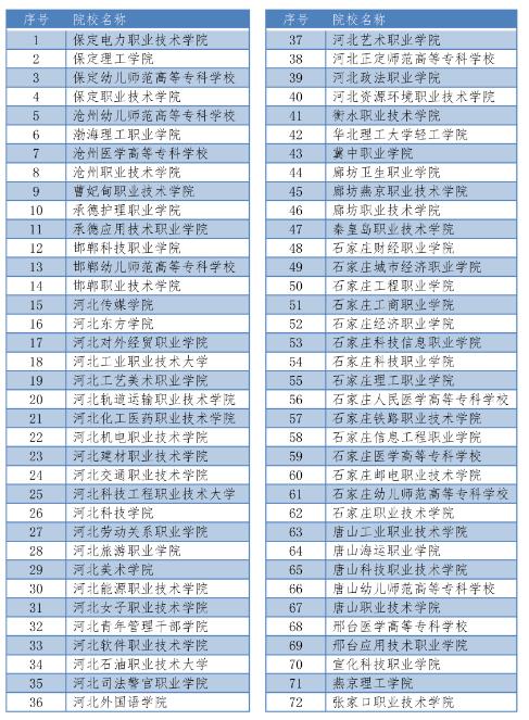 经省教育厅批准,2023年河北省实施高职单招的省内院校共有72所,名单如下:
