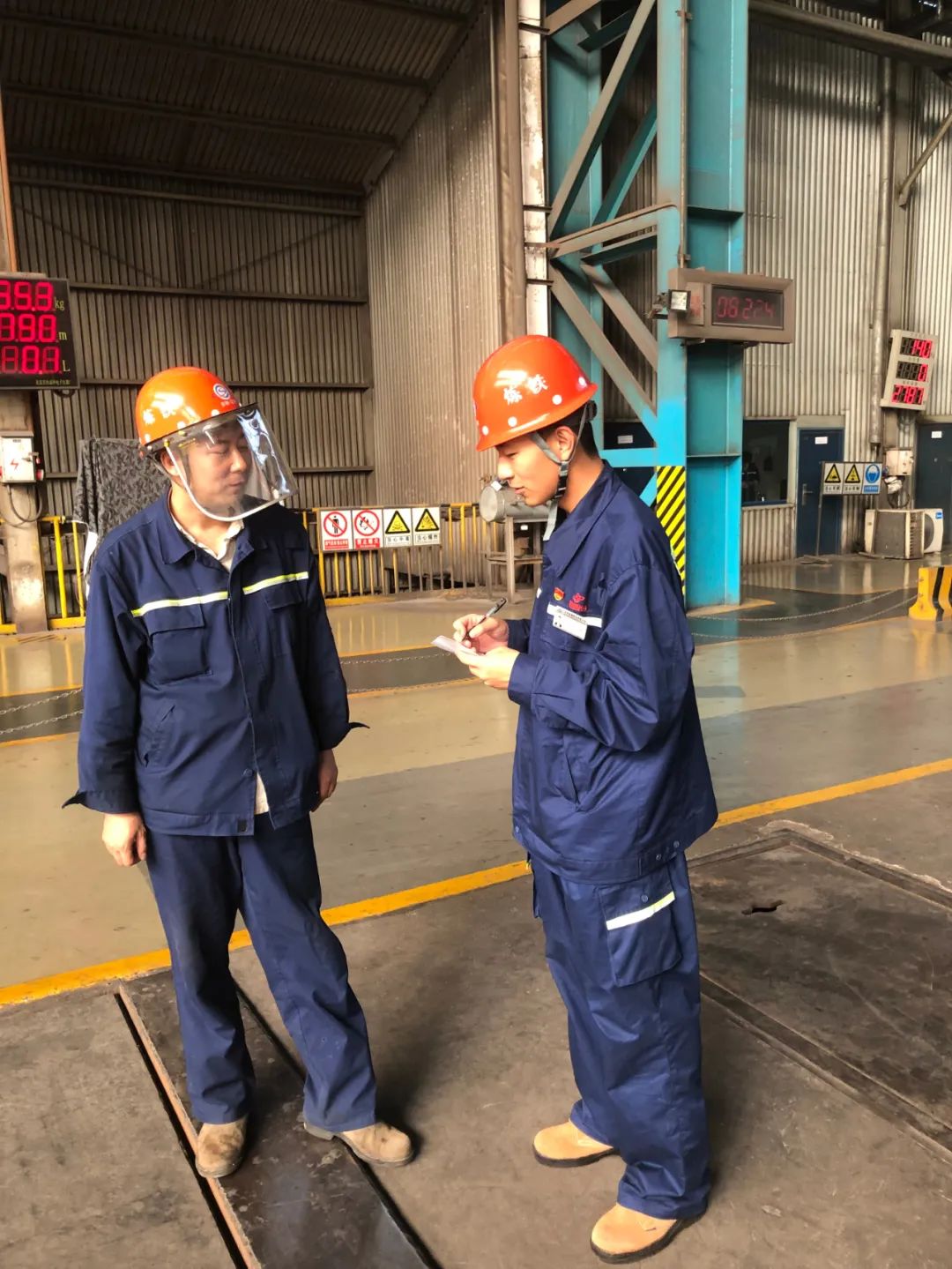 2019届毕业生唐黎明在首钢与老师傅沟通工作