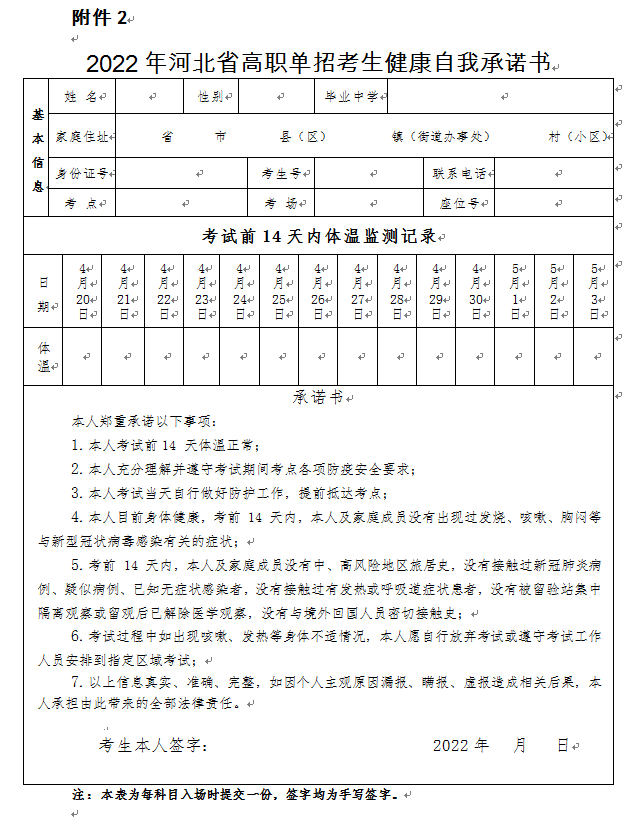 (六)提交本人签字的《2022年河北省高职单招考生健康自我承诺书》(见附件2)。