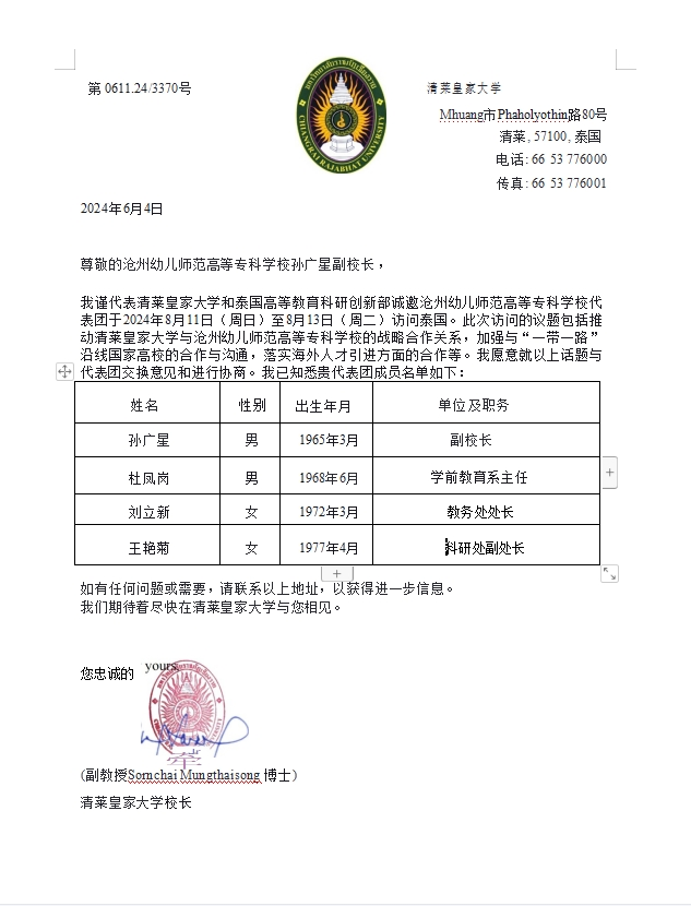 应泰国清莱皇家大学、芬兰罗约阿应用科学大学的邀请,学校派以孙广星副校长为团长的出访团一行4人(孙广星、杜凤岗、刘立新、王艳菊),于2024年8月11日至2024年8月17日访问泰国清莱皇家大学、芬兰罗约阿应用科学大学。 邀请函: