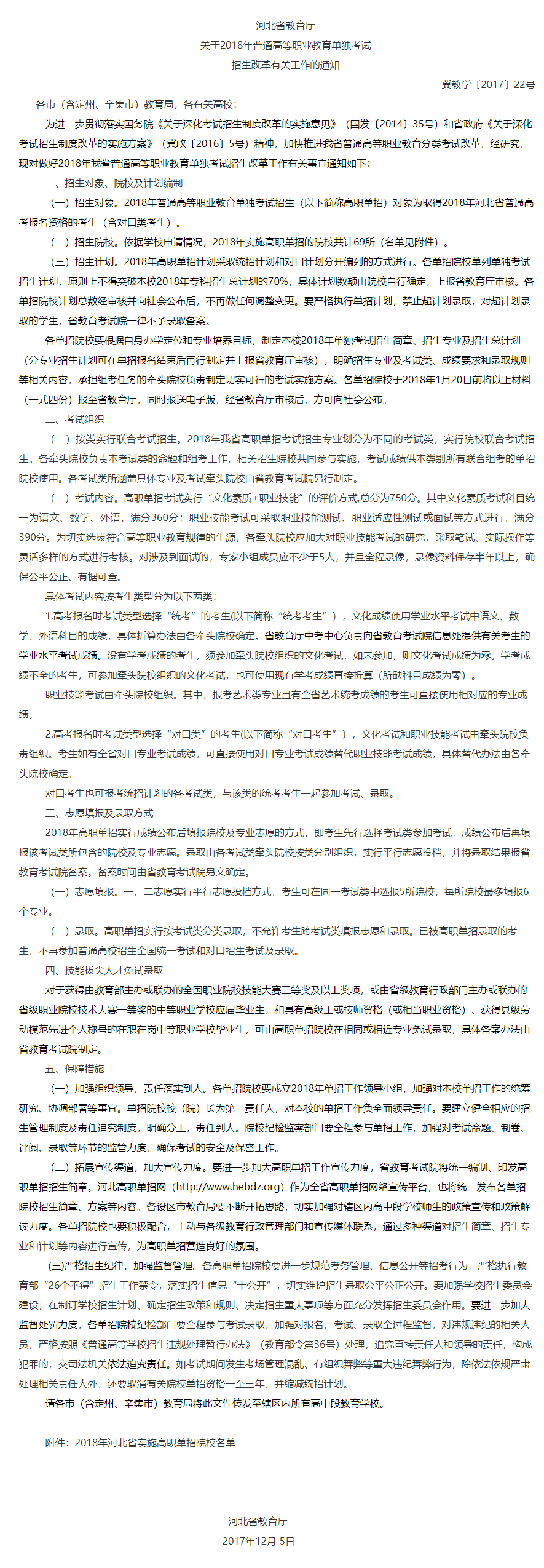 河北省教育厅关于2018年普通高等职业教育单独考试招生改革有关工作的通知