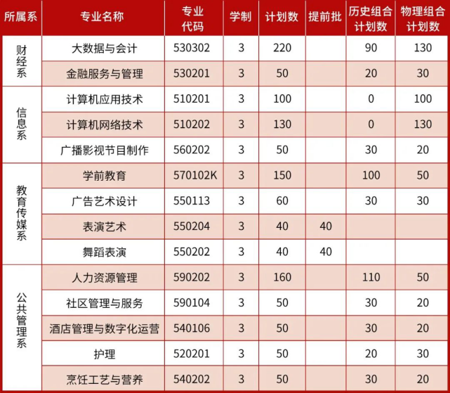 公共管理系招生专业:人力资源管理、工商企业管理、社区管理与服务、智慧健康养老服务与管理、酒店管理与数字化运营、行政管理(风险控制)、行政管理(应急管理)、护理、烹饪工艺与营养。
