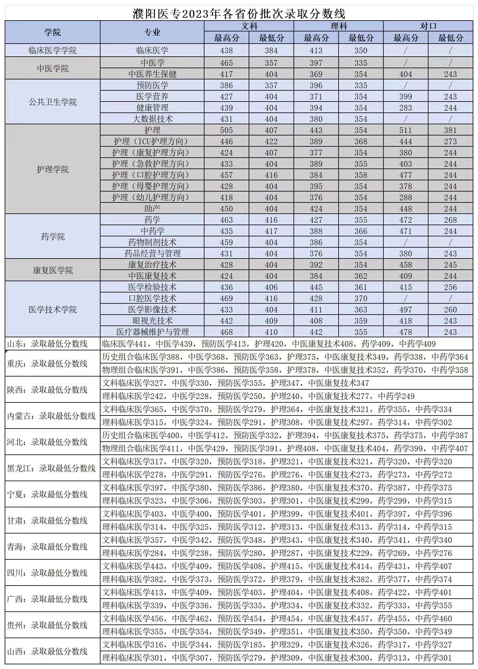 濮阳医学高等专科学校2023年各省份批次录取分数线