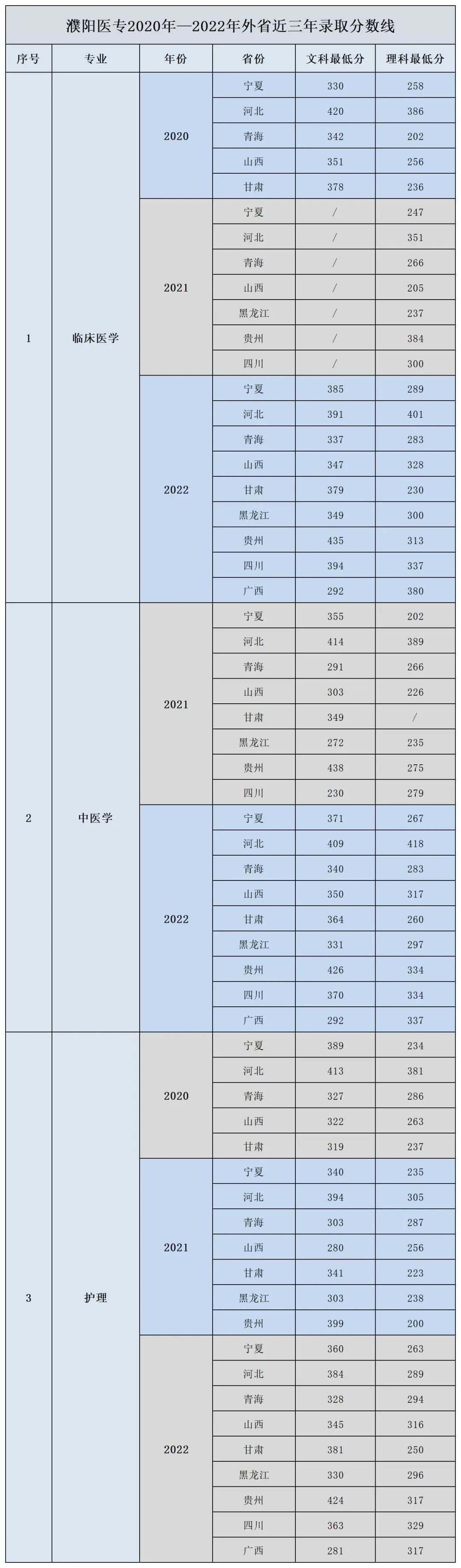 濮阳医学高等专科学校2020年-2022年外省录取分数线