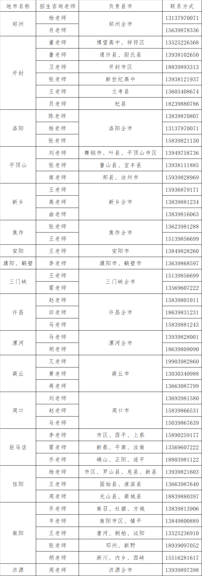 2024年各地市招生咨询老师联系方式