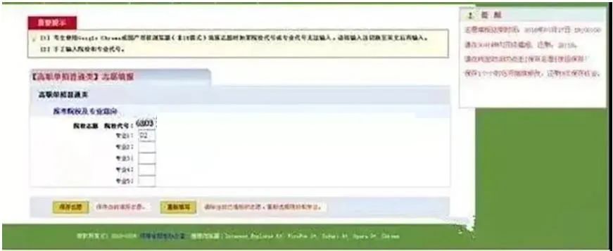 考生如果确认自己填报的志愿信息(6235)无误后,点击志愿填报页面最下方的点击“保存志愿”按钮保存志愿信息。如果信息有误,想全部重新填写志愿,可以点击页面最下方“重新填写”按钮,清空已填写的志愿信息。考生可以进行不超过两次的志愿修改,以网上最后一次保存的志愿为准。填报时间截止后将无法补报和更改,提醒广大考生按时认真填报志愿。