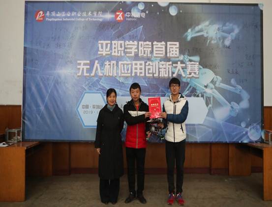 平职学院首届无人机应用创新大赛:新华网记者郭老师给获奖选手颁发证书