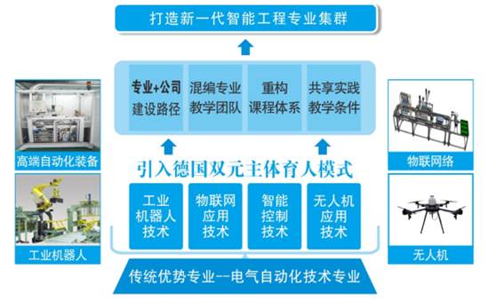 自动化与信息工程学院以传统优势专业电气自动化技术为本,以工业机器人技术、物联网应用技术、智能控制技术、无人机应用技术四个新型专业为体,引入德国双元主体育人模式,实施“专业+公司”建设路径,混编专业教学团队,重构课程体系,共享实践教学条件,打造新一代智能工程专业集群,赋能未来人才培养,服务社会企业发展需求。