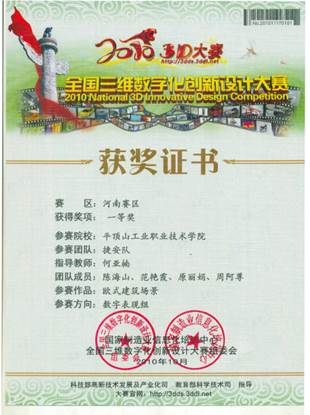 2010年荣获“全国三维数字化创新设计大赛”一等奖