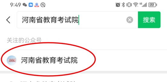 2、微信搜索“河南省教育考试院” 微信公众号并关注。