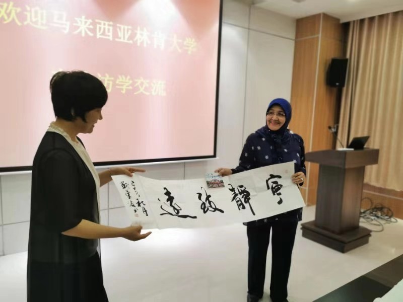 交流会后,在贾校长带领下,林肯大学来访人员参观了我校校园风景、学生生活和学习环境。最后,双方互赠纪念品并合影留念。
